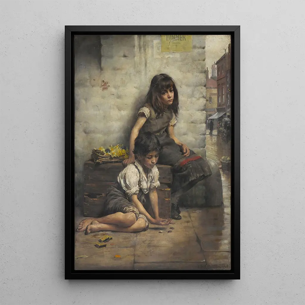 Kohteessa "Orphelins" Thomas Benjamin Kennington vangitsee koskettavalla hienovaraisuudella lasten menettämän viattomuuden. Kompositio korostaa kahta nuorta orpotarta, joiden kasvot hehkuvat melankoliaa, ja ne ovat uppoutuneina surun ja yksinäisyyden tunnelmaan. Pehmeät värit, pääasiassa maanläheisiä sävyjä ja pastellinvärejä, luovat vaikuttavan kontrastin kohtauksen emotionaalisen intensiteetin kanssa. Kenningtonin hallitsema öljyvärimaalauksen tekniikka mahdollistaa vaatteiden tekstuurien ja pehmeän valon kuvaamisen, joka valaise lasten kasvoja, lisäten teokseen lähes kosketeltavan ulottuvuuden. Tämä taidegrafiikka kutsuu pohtimaan lapsuuden haurautta ja niitä haasteita, joita nämä nuoret sielut kohtaavat.