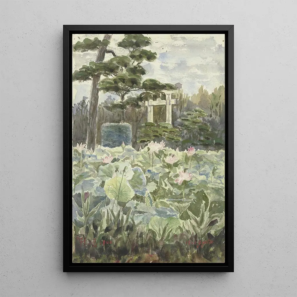 Fritz Hauckin taidegrafiikan "Osan japanilaisesta puutarhasta" luo rauhan ja mietiskelyn tunnelman. Hienovaraiset vihreän ja sinisen sävyt sekoittuvat harmonisesti, luoden elävän taulun, jossa jokainen elementti vaikuttaa hengittävän. Vesiväritekniikka, jonka taiteilija hallitsee, mahdollistaa valon ja varjon vangitsemisen, tuoden eloa tähän rehevään puutarhaan. Kukka- ja lehtitarkkuudet kutsuvat katsojan uppoutumaan tähän lumottuun maisemaan, jossa aika vaikuttaa pysähtyneeltä, tarjoten visuaalisen pakomatkan rauhan maailmaan.