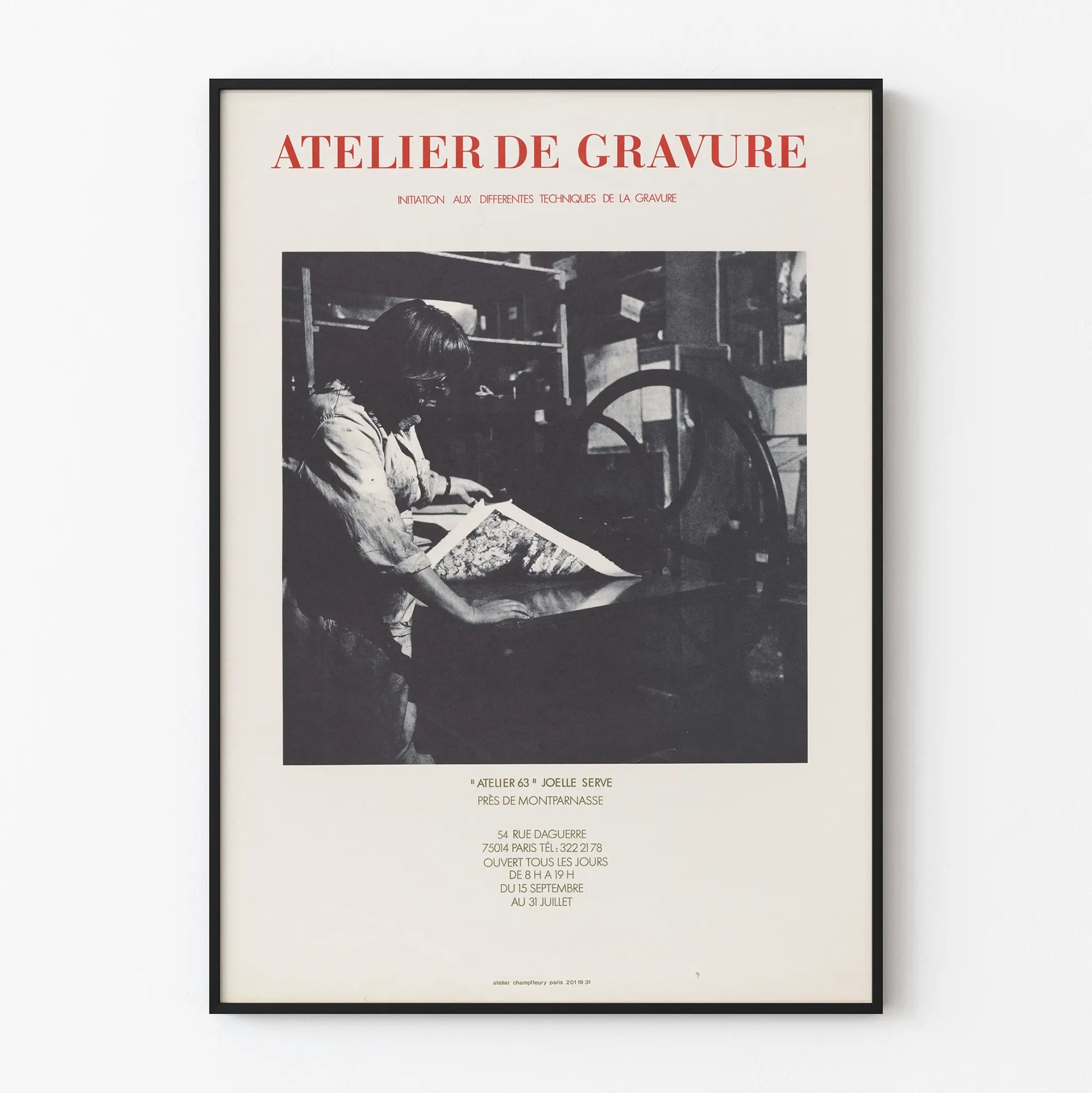 Julisteen yläosassa, selkeästi näkyvissä punaisilla kirjaimilla, lukee "KAIVERTAMO", korostaen tämän graafisen teoksen opetuksellista ja käsityöläistä luonnetta. Kuvan alla on tarkat tiedot, jotka kertovat "Ateljee 63" -nimisestä työpajasta, jota johtaa Joelle Serve, sijaitsee Montparnassen lähellä Pariisissa, 14. kaupunginosassa. Mainittu on osoite 54 rue Daguerre sekä aukioloajat, mikä lisää tämän koriste-esineen todellisuutta ja paikallisuutta.