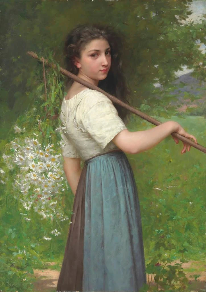 Cueillette de marguerites : bucolinen taidegrafiikan kohtaus, joka huokuu lempeyttä