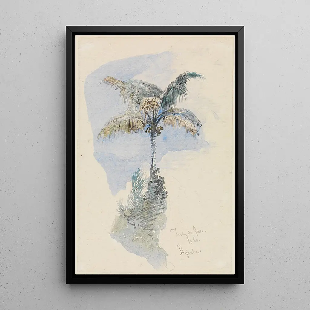 Ferdinand Kellerin teos "Palmun tutkimus" johdattaa meidät rehevään maailmaan, jossa kasvillisuus kukoistaa kirkkaan taivaan alla. Majesteettiset ja kohoavat palmut kohoavat ylpeinä, niiden hennot lehdet tanssivat tuulen mukana. Väritasapaino, jossa hallitsevat eloisat vihreän sävyt ja sinisen vivahteet, luo rauhallisen ja rentouttavan tunnelman. Kellerin tekniikka, joka yhdistää vesiväriä ja piirustusta, antaa tälle taululle keveyttä ja sulavuutta, jotka vangitsevat luonnon olemuksen. Jokainen yksityiskohta ja sävy kutsuvat hiljaiseen ja mietiskelevään pohdintaan.