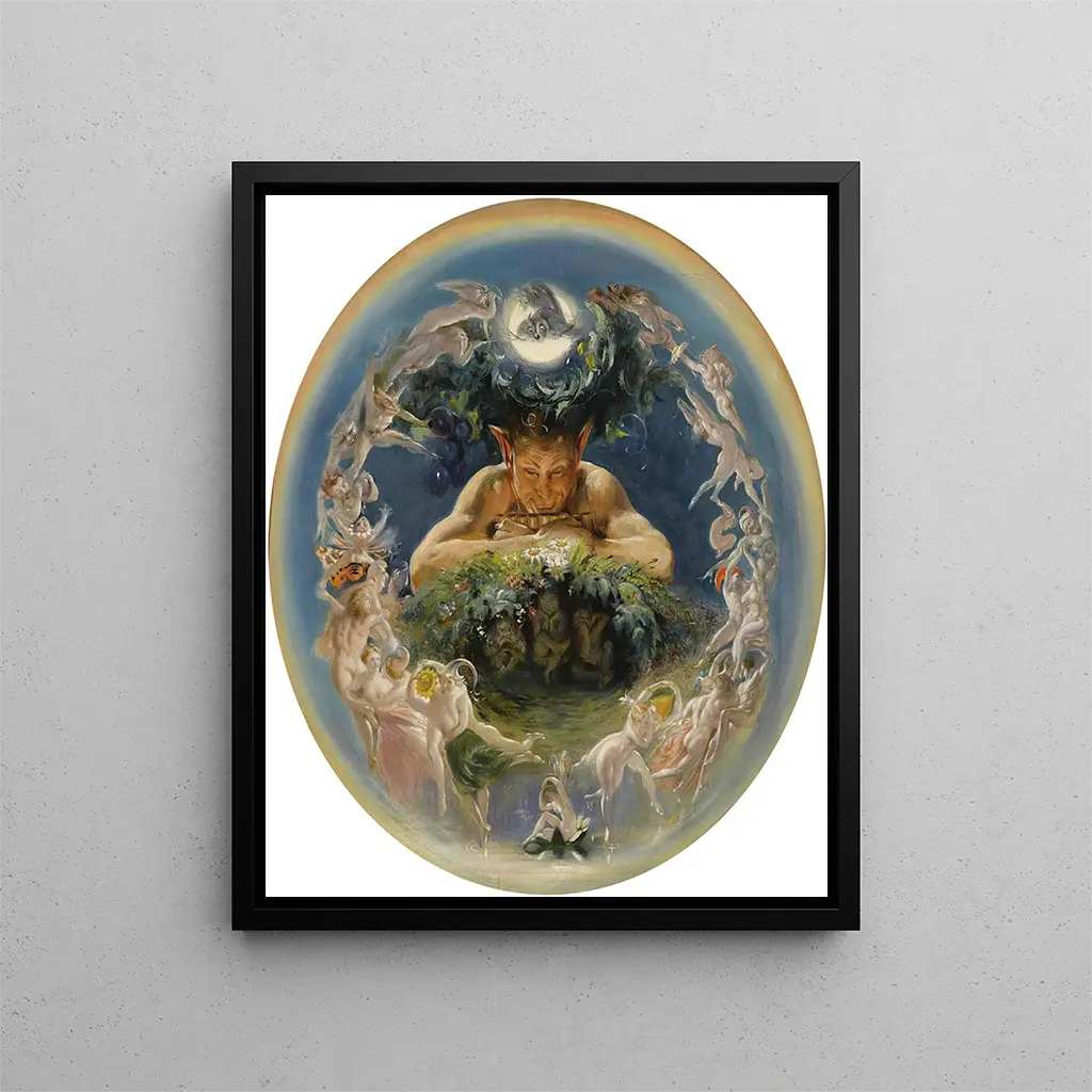 Romanttisen taiteen lumoavassa maailmassa teos "Pan ja tanssivat keijut" Daniel Macliseiltä erottuu kyvyllään vangita luonnon leikkisä ja mystinen henki. Tämä keveä maalaus kuljettaa meidät maailmaan, jossa jumalallinen ja maallinen kietoutuvat toisiinsa, jossa mytologia herää eloon hienovaraisien hahmojen ja elävien väripalettien kautta. Teos viittaa ajattomaan tanssiin, hetkeen, jossa ilo ja taikuus kohtaavat, kutsuen katsojan uppoutumaan tähän satumaiseen kohtaukseen. Maclise muistuttaa tämän teoksen kautta, että taide voi olla portti kohti odottamattomia todellisuuksia, vanhojen legendojen kaikuja, jotka jatkavat resonointiaan nykyisissä mielikuvituksissamme.