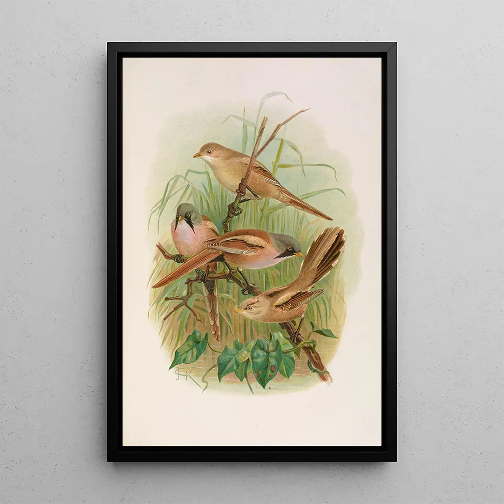 Taidegrafiikka Panurus biarmicus, Johann Friedrich Naumannin teos, johdattaa meidät herkkään maailmaan, jossa luonto ilmaisee itseään lempeästi. Tämä taulu, joka esittää kuuluisan viiksisiipisen räkättirastaan, erottuu pastellisävyillään ja harmonisella koostumuksellaan. Höyhenien yksityiskohtaiset vivahteet ja epätarkka tausta luovat rauhoittavan, lähes unenomaisen tunnelman. Naumann, tarkkailun lahjakkuudellaan, onnistuu vangitsemaan tämän linnun olemuksen, kunnioittaen luonnon haurasta kauneutta. Jokainen sivellinvedos vaikuttaa kuiskaavan ylistystä luonnolle, kutsuen katsojan pysähtymään ja ihailemaan.