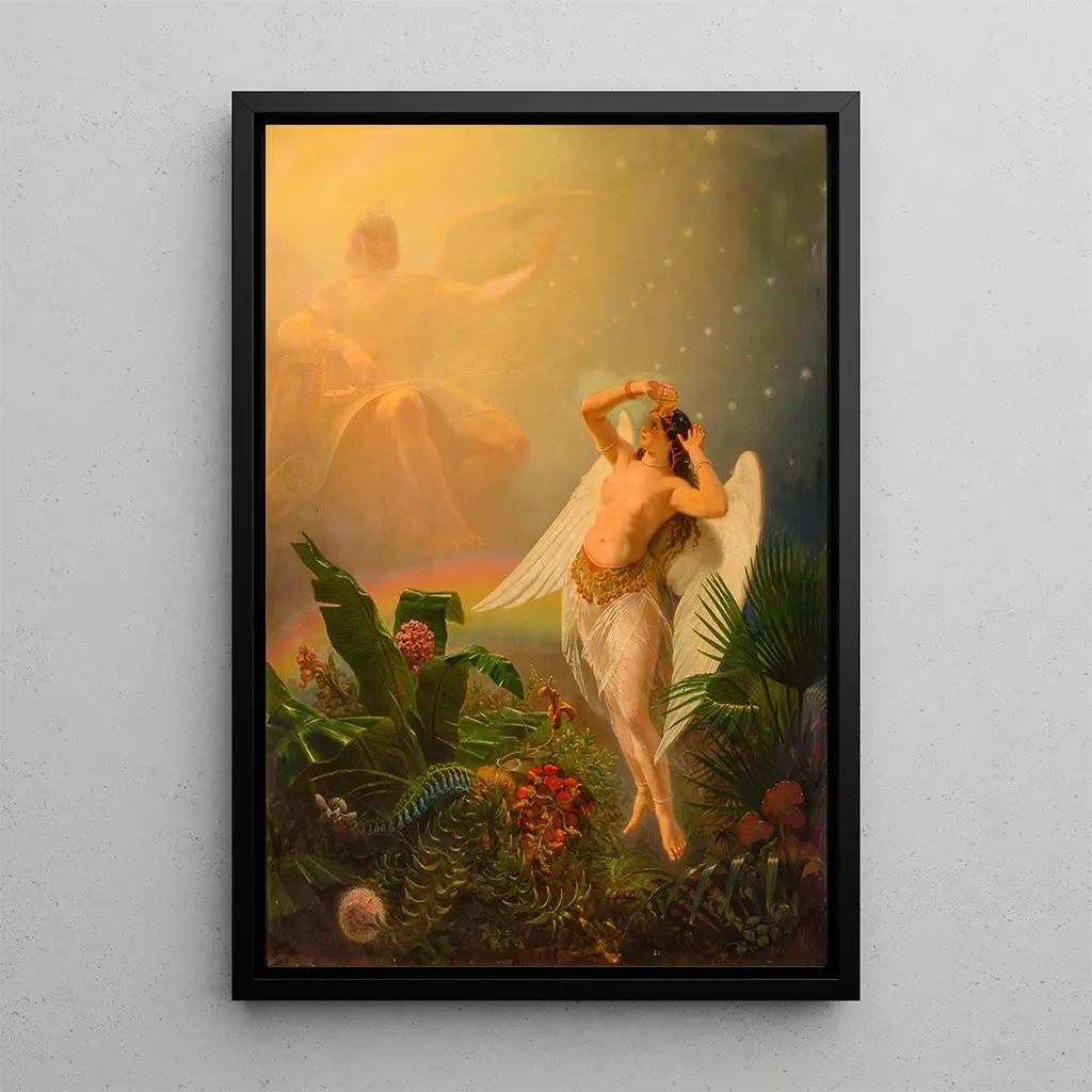 Kohteessa "Le Paradis et le Péri" Emanuel Gottlieb Leutze kuljettaa meidät maailmaan, jossa ylevä ja mystinen kohtaavat. Tämä teos, täynnä eloisia värejä ja yksityiskohtaisia kuvioita, luo unenomaisen tunnelman. Hahmot, hienovaraisesti maalatut, näyttävät kelluvan ajattomassa tilassa, kun taas sinisen ja kullan sävyt luovat rauhallisuuden tunteen. Leutze käyttää öljyväritekniikkaa, joka herättää eloon jokaisen elementin, vaatteiden laskoksista kasvojen ilmeisiin, kutsuen katsojan sukeltamaan tähän runolliseen kohtaukseen.
