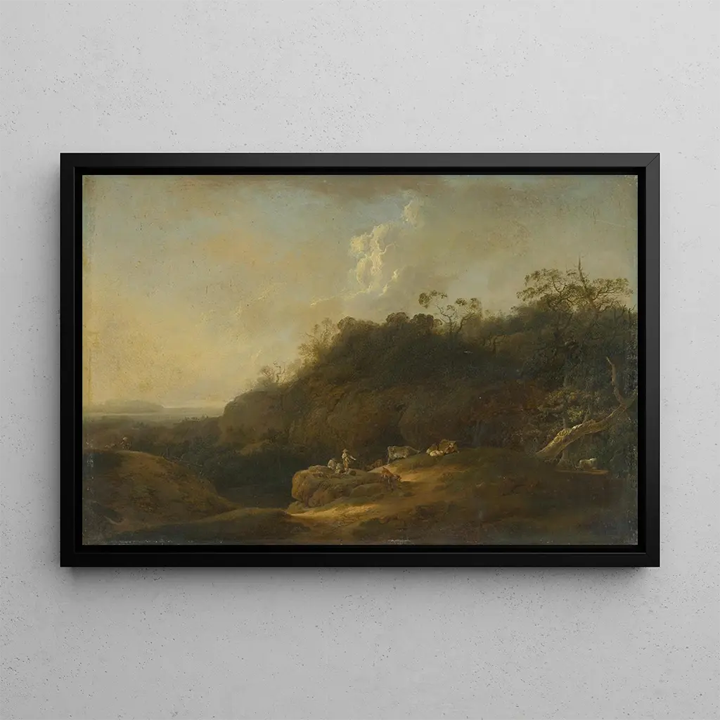 La reproduction de "Paysage avec berger" de Jan Wils nous plonge dans un tableau pastoral où la tranquillité règne en maître. Les teintes terreuses et les nuances de vert évoquent une nature intacte, tandis que la présence du berger, symbole de paix et de simplicité, ancre l'œuvre dans une réalité bucolique. La technique de Wils, marquée par des coups de pinceau fluides et une lumière douce, crée une atmosphère chaleureuse et accueillante. Chaque élément du paysage, des arbres majestueux aux collines ondulantes, contribue à une harmonie visuelle qui invite à la contemplation et à l'évasion.