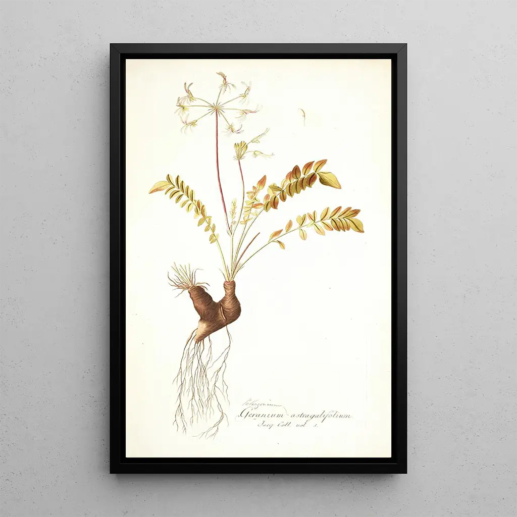 Taidegrafiikka Pelargonium astragalifolium, jonka on luonut Nikolaus Joseph Freiherr von Jacquin, sukeltaa rikkaaseen ja eloisaan kasvitieteelliseen maailmaan. Kirkkaat vihreän ja vaaleanpunaisen sävyt, yhdistettynä huolellisiin yksityiskohtiin, paljastavat tämän kasvin herkkän kauneuden. Harmoninen koostumus, jossa jokainen terälehti näyttää vangitsevan valon, luo rauhallisen ja ihmeellisen tunnelman. Taiteilija, tarkalla maalaustekniikallaan, onnistuu välittämään kasvilajin olemuksen, kutsuen katsojan tarkkailevaan ja kunnioittavaan luonnon ihailuun.