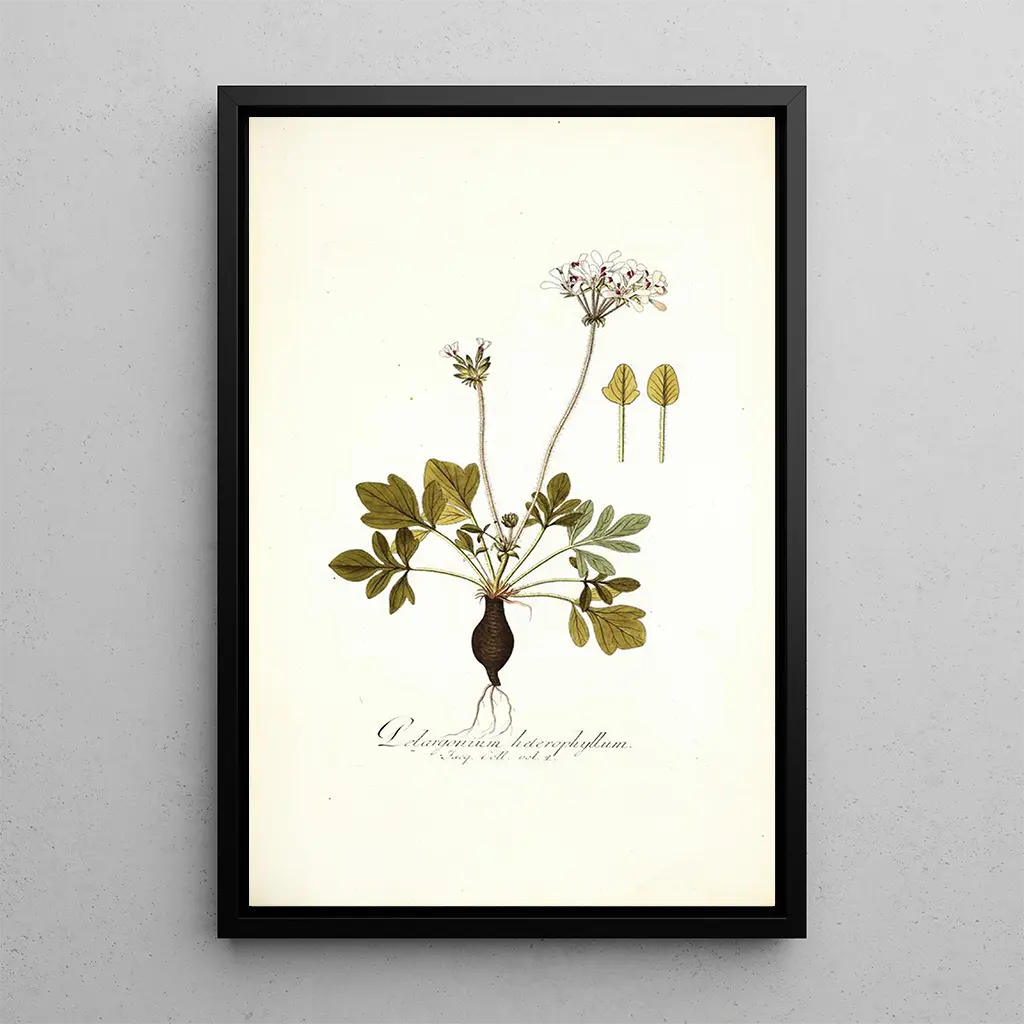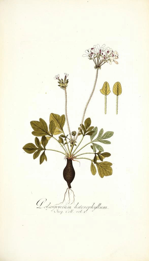 Pelargonium heterophyllum-taidegrafiikka, jonka on tehnyt Nikolaus Joseph Freiherr von Jacquin, juhlistaa kasviston rikkautta. Tämä herkkä teos esittelee monimuotoisia lehtiä ja eloisia värejä, jotka vangitsevat katseen. Vesiväritekniikka, käytettynä hienovaraisesti, mahdollistaa lehtien ja terälehtien läpinäkyvyyden sekä tekstuurin toistamisen, luoden samalla elävän ja rauhoittavan ilmapiirin. Jokainen yksityiskohta on huolellisesti tarkkailtu, mikä kertoo intohimosta kasvitieteeseen ja halusta jakaa luonnon kauneutta.