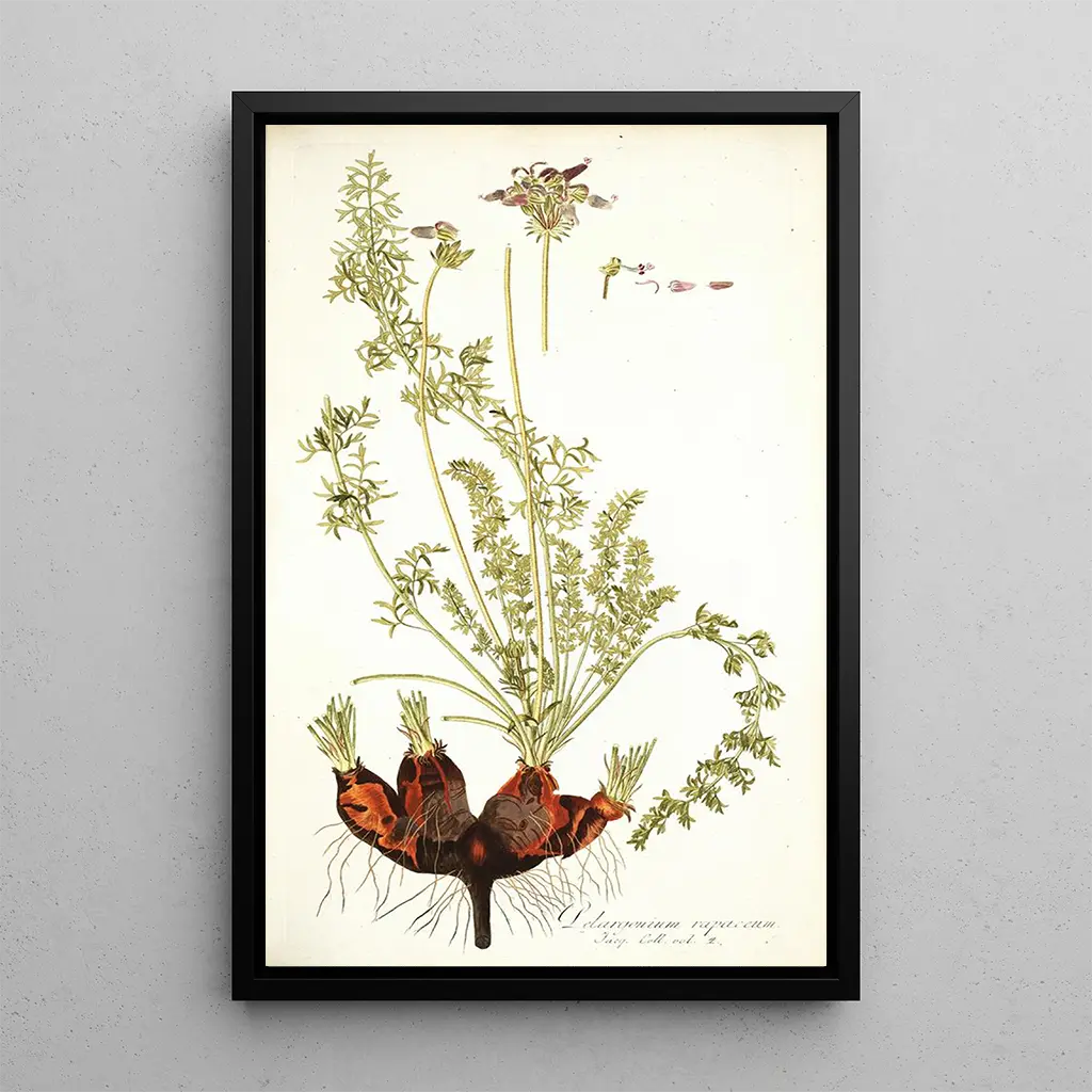 Taidegrafiikka Pelargonium rapaceum, jonka on luonut Nikolaus Joseph Freiherr von Jacquin, on kunnianosoitus kasvien kauneudelle ja monimuotoisuudelle. Vihreän ja violetin sävyt, hienovaraisesti sekoittuneina, kuvaavat kasviston rikkautta. Tarkkuus yksityiskohdissa, joka on Jacquinin kasvitieteellisen tyylin tunnusmerkki, mahdollistaa jokaisen terälehden hienostuneisuuden ja varren vahvuuden kokemisen. Tämä teos, sekä tieteellinen että taiteellinen, vie katsojan rehevään puutarhaan, jossa jokainen elementti on huolellisesti ja intohimoisesti esillä.