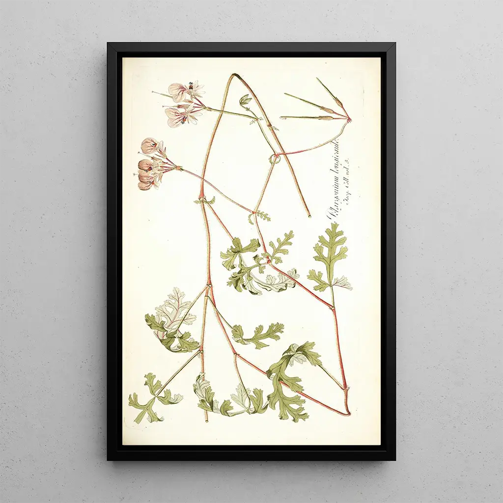 Taidemerkintä Pelargonium longicaule, jonka on signeerannut Nikolaus Joseph Freiherr von Jacquin, tarjoaa elävän ja värikkään näkymän tähän kiehtovaan kasviin. Kompositio korostaa kirkkaiden sävyjen kukkia, jotka vaihtelevat punaisesta violettiin, ympäröitynä rehevän vihreillä lehdillä. Vesiväritekniikka, jota on käytetty suurella taidolla, tuo esiin terälehtien keveyden ja hienostuneisuuden, luoden iloisen ja elävän ilmapiirin. Tämä taidegrafiikka ei ainoastaan kuvaa luonnon kauneutta, vaan myös taiteilijan intohimoa kasvi maailmaa kohtaan, kutsuen visuaaliseen tutkimusmatkaan kasvien ihmeisiin.