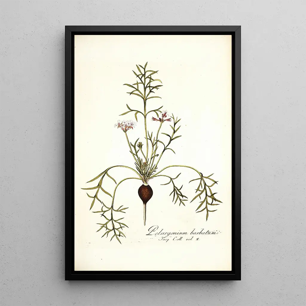 Pelargonium barbatum -taidegrafiikka, jonka on luonut Nikolaus Joseph Freiherr von Jacquin, on teos, joka kutsuu ihmettelemään kasviluonnon kauneutta. Värikkäillä sävyillä ja yksityiskohtaisilla piirteillä tämä taidegrafiikka vangitsee kasvin olemuksen. Vihreän, vaaleanpunaisen ja valkoisen sävyt sekoittuvat harmonisesti, luoden rauhoittavan ja virkistävän tunnelman. Vesiväritekniikka, jota on käytetty mestarillisesti, korostaa terälehtien hienostuneisuutta ja lehtien tekstuuria. Jokainen sivellinvedos tuntuu herättävän tähän kasviin uuden elämän, muuttaen yksinkertaisen kasvitutkimuksen kiehtovaksi taideteokseksi.