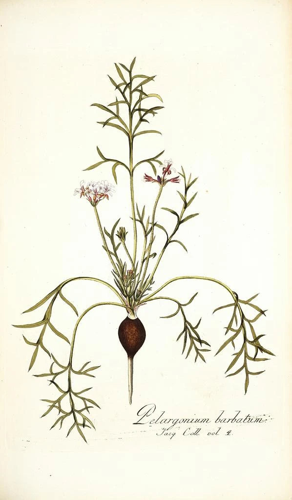 Nikolaus Joseph Freiherr von Jacquin, 1700-luvun kasvitieteilijä ja taiteilija, on näytellyt keskeistä roolia kasvien tieteellisessä kuvittamisessa. Wienin yliopistossa kouluttautunut, hänet vaikutti naturalismin ja rokokon virtaukset, jotka sisällyttivät esteettisiä elementtejä kasvitieteellisiin tutkimuksiinsa. Hänen teoksensa, kuten Pelargonium barbatum, heijastavat aikaa, jolloin tiede ja taide yhdistyivät tutkiakseen biodiversiteettiä. Jacquin matkusti siirtokunnissa, keräten eksoottisia näytteitä, jotka rikastuttivat hänen aikansa kasvitieteellistä tietämystään. Hänen perintönsä elää edelleen, inspiroiden taiteilijoita ja tiedemiehiä vuosisatojen ajan.