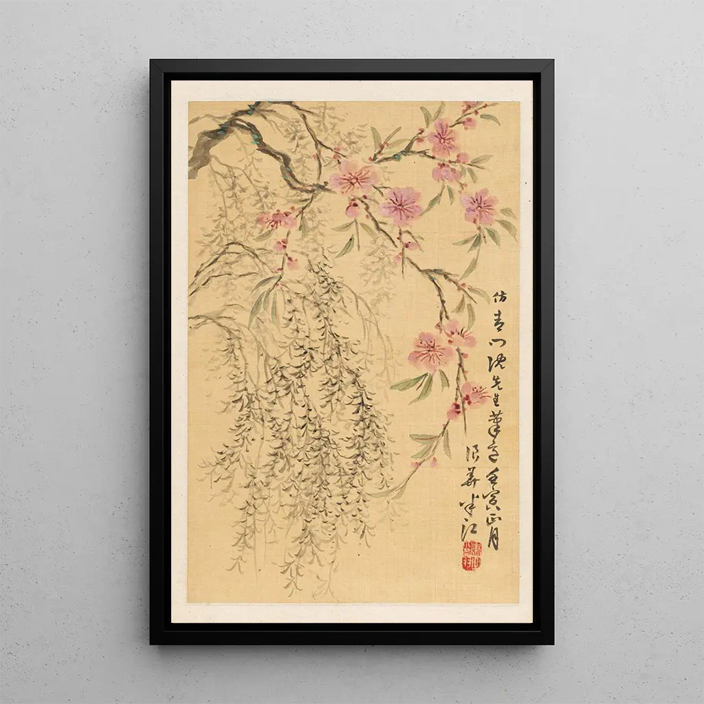 La reproduction "Fleurs de pêcher et saules" d'Okada Hankō on kevään kauneuden ylistys, jossa herkkä vaaleanpunainen kukka yhdistyy sulavaan pajuun. Pastellivärit, jotka vaihtelevat pehmeästä vaaleanpunaisesta lempeään vihreään, luovat raikkauden ja uudistumisen tunnelman. Taiteilijan käyttämä sulava ja kevyt sivellintekniikka herättää jokaisen terälehden ja lehden eloon, luoden elävän taulun, joka näyttää hengittävän. Tämä mestariteos kutsuu rauhalliseen pohdiskeluun, jossa voi melkein kuulla tuulen kuiskauksen oksien lomassa.
