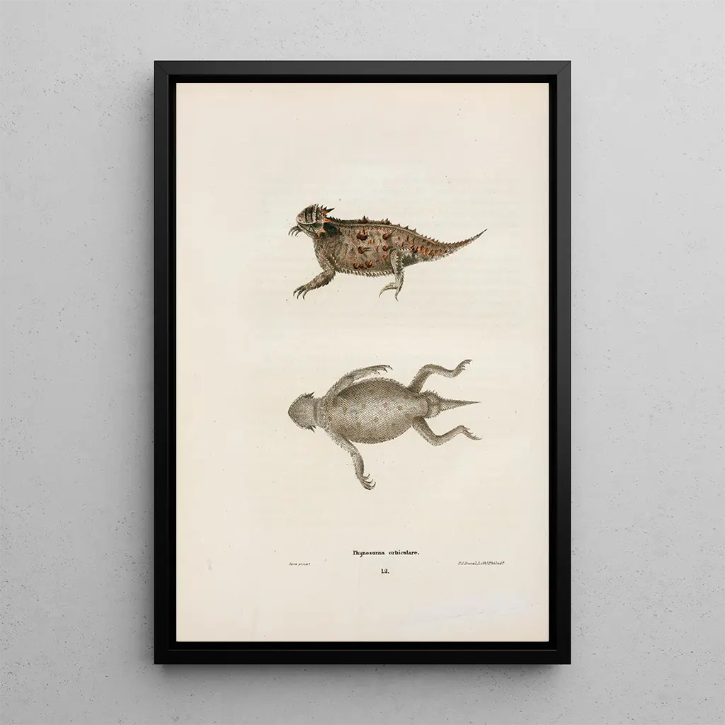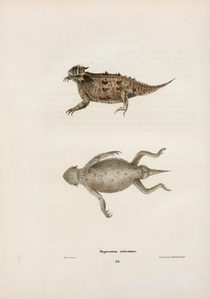 John Edwards Holbrook, luonnontieteilijä ja 1800-luvun taiteilija, teki vaikutuksen aikakauteensa panoksellaan eläinlajien kuvittamiseen. Kasvettuaan ympäristössä, jossa luonto oli läsnä kaikkialla, hän kehitti intohimon liskoihin ja sammakkoeläimiin. Holbrookia vaikutti aikansa tieteelliset löydöt, ja hän pyrki yhdistämään taiteen ja tieteen teoksissaan. Hänen työnsä oli keskeisessä roolissa amerikkalaisten lajien dokumentoinnissa, tehden hänestä merkittävän hahmon luonnontieteen alalla. Hänen taidegrafiikkansa, kuten tämä Phrynosome orbiculaire, todistavat hänen sitoutumisestaan eläinlajin monimuotoisuuden tallentamiseen.