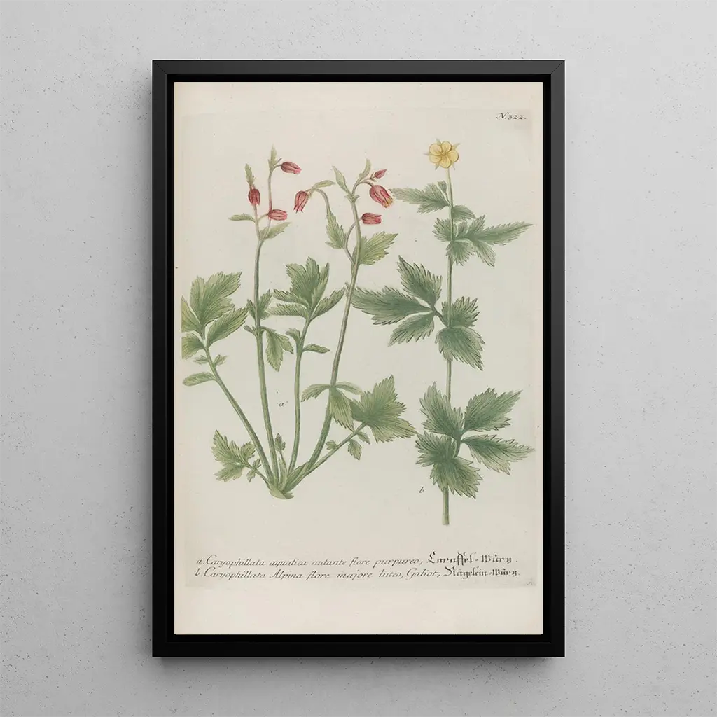 Phytanthoza iconographia Pl045 -taidegrafiikka viedä meidät maailmaan, jossa luonto kukoistaa loistokkaasti. Tämä teos, joka on täynnä yksityiskohtia, esittelee harmonisen koostumuksen eksoottisista kasveista, huolellisesti aseteltuna herkälle taustalle. Värikkäät, syvistä vihreistä kirkkaisiin punaisiin vaihtelevat sävyt, kuvaavat monimuotoisuutta ja kasvilajin kauneutta. Johann Wilhelm Weinmannin käyttämä kaiverrustekniikka lisää syvyyttä ja tekstuuria jokaiseen lehtiin ja terälehtiin, luoden lähes elävän tunnelman. Tämä taulu kutsuu katselijaa pysähtymään ja tarjoaa kiehtovan katsauksen 1700-luvun kasvitieteeseen.