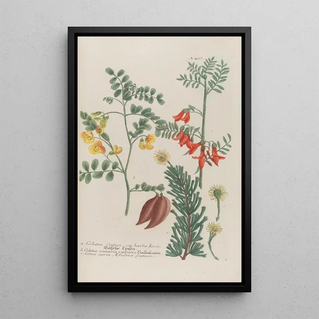 Taidegrafiikka Phytanthoza iconographia Pl129 kuljettaa meidät rehevään puutarhaan, jossa jokainen kasvi vaikuttaa kertovan tarinan. Rikkaan ja monipuolisen väripaletin ansiosta tämä teos korostaa kasvilajien monimuotoisuutta. Värikkäät vihreän, keltaisen ja violetin sävyt sekoittuvat harmonisesti, luoden visuaalisesti kiehtovan koostumuksen. Kaiverrustekniikka, tarkka ja hienovarainen, mahdollistaa jopa hienoimpien yksityiskohtien, kuten lehtien suonien ja kukkien terälehtien, tallentamisen. Tämä taulu kutsuu mietiskelyyn ja ihailuun, juhlistaen luonnon kauneutta kaikessa loistossaan.