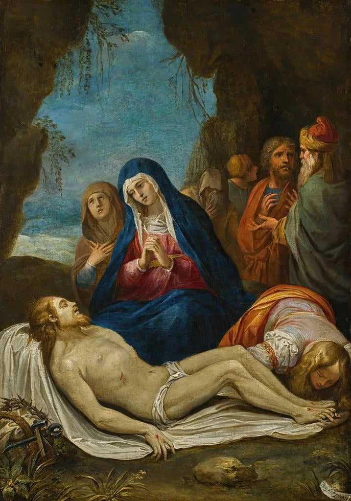 Giuseppe Cesarin Piéta, joka tunnetaan myös nimellä Cavalier d'Arpino, on koskettava kuvaus Neitsyt Marian ja Kristuksen ruumiin kantamisesta. Tämä taulu, joka on täynnä lämpimiä värejä ja yksityiskohtia, luo rauhan ja kivun tunnelman. Vaatteiden drapeeraukset on maalattu virtuoosisen tekniikan avulla, luoden vaikuttavan kontrastin kasvojen pehmeyden ja kohtauksen vakavuuden välillä. Hento käytetty valo korostaa hahmojen ilmeitä, tehden tästä teoksesta sekä emotionaalisen että pohdiskelevan. Jokainen sivellinvedos tuntuu kantavan merkitystä, kutsuen katsojan pohtimaan kärsimystä ja lunastusta.
