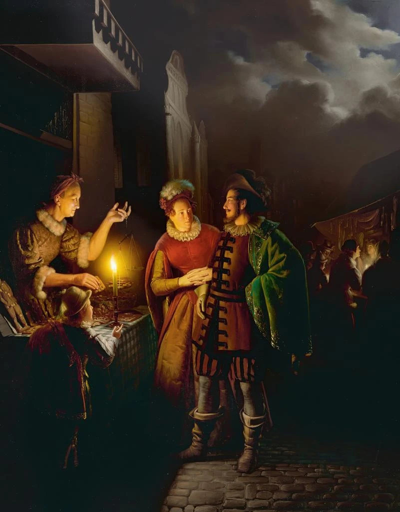 Piparkakkutalo myyjä kynttilänvalossa - Petrus van Schendel