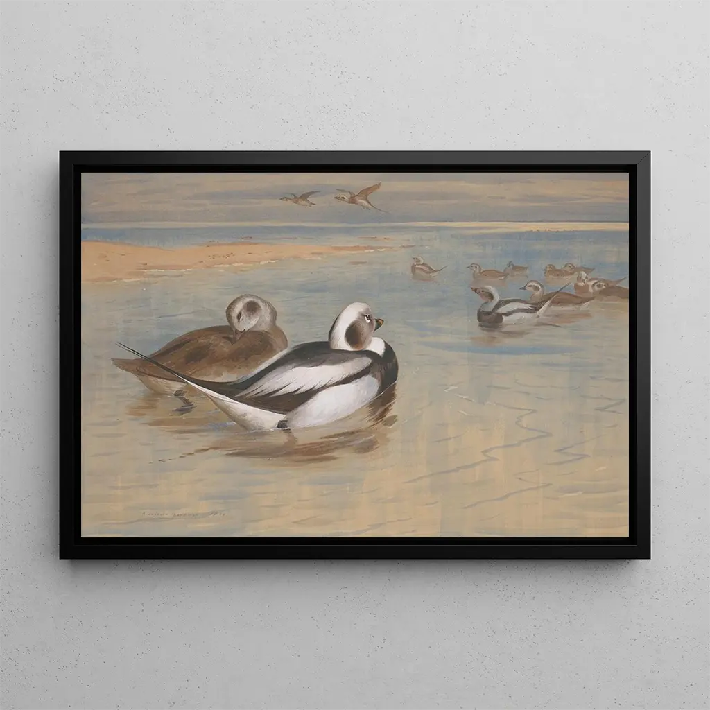 Archibald Thorburnin "Long-Tail Ankat" -taidegrafiikka kuvaa hienovaraisesti vesieläinten kauneutta. Ankat, jotka on esitetty luonnollisessa elinympäristössään, liikkuvat sulavasti veden päällä, kun taas kimaltelevat heijastukset lisäävät kohtauksen runollista ulottuvuutta. Pehmeät värit ja yksityiskohtaiset höyhenet paljastavat Thorburnin kyvyn vangita villieläimen elämän tarkasti ja vaikuttavasti. Tämän teoksen rauhallinen tunnelma kutsuu pohdiskeluun, muistuttaen aamun rauhasta lammen rannalla.