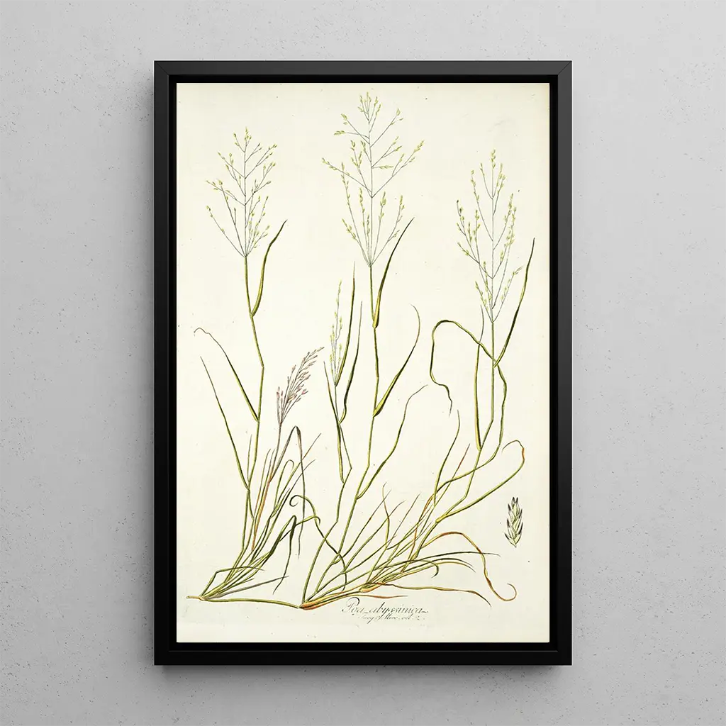 L reproduction de Poa abyssinica johdattaa meidät herkkään kasviuniversumiin, jossa yksityiskohtien hienostuneisuus yhdistyy pehmeiden väripalettien kanssa. Vihreän ja keltaisen sävyt sulautuvat harmonisesti, viitaten valoon, joka suodattuu lehtien läpi. Vesiväritekniikka, jota käyttää Nikolaus Joseph Freiherr von Jacquin, antaa tälle teokselle kevyen ja ilmavan tunnelman, kutsuen katsojan rauhalliseen pohdintaan. Jokainen ruohoaines näyttää tanssivan tuulessa, luoden liikkeen ja elämän tunteen.
