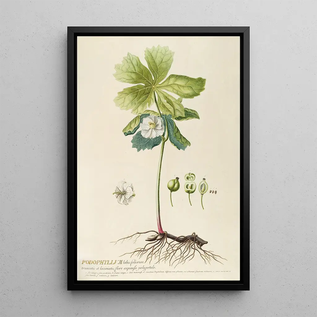 La taidegrafiikka Podophyllumista Georg Dionysius Ehretin toimesta on todellinen ylistys kasvien kauneudelle. Tämä teos, joka on toteutettu poikkeuksellisella kasvitieteellisellä tarkkuudella, korostaa tämän kasvin hienovaraisia muotoja ja vihreän sävyjä. Lehtien ja kukkien pienet yksityiskohdat, jotka on tehty hienovaraisella kaiverrustekniikalla, luovat sekä rauhoittavan että kiehtovan tunnelman. Taiteilija onnistuu vangitsemaan luonnon olemuksen, kutsuen katsojan sukeltamaan rauhan ja harmonian maailmaan.