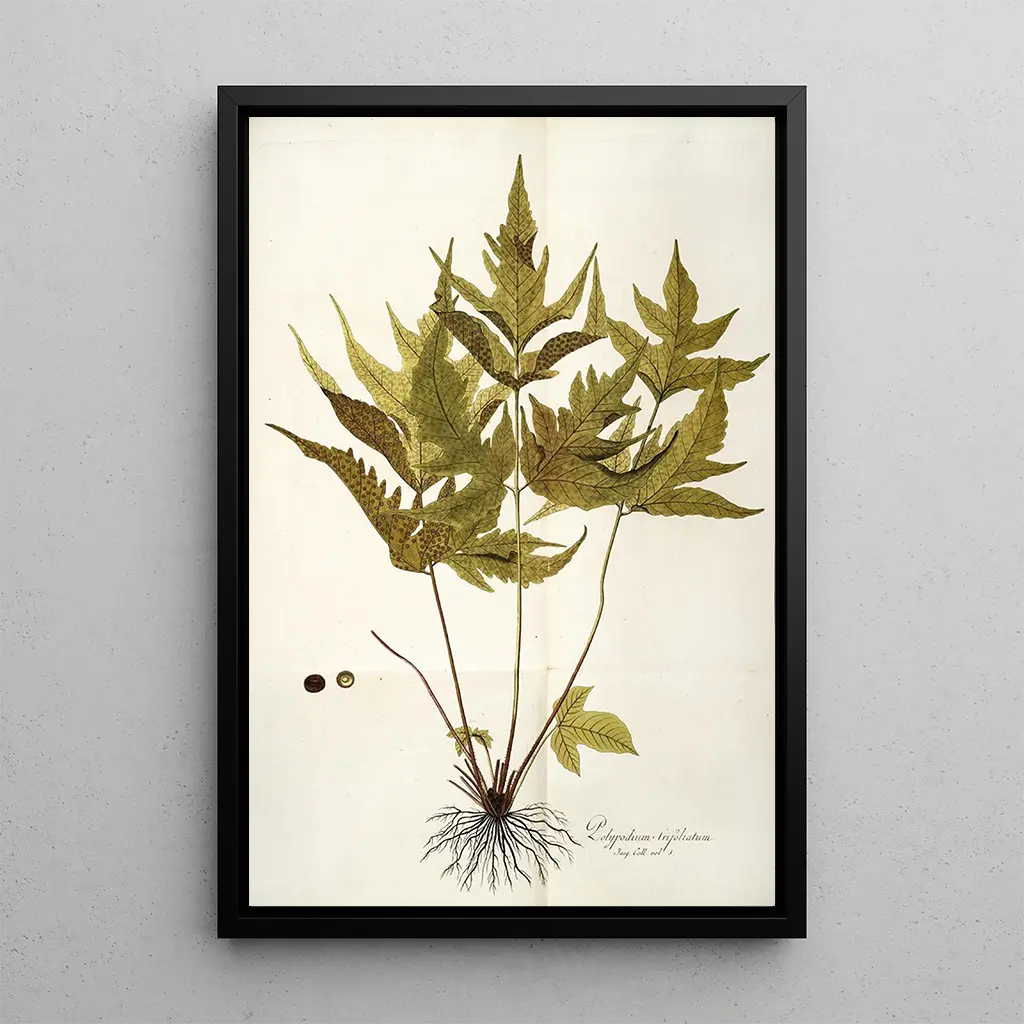 Polypodium trifoliatum -taidegrafiikka viedään meidät raikkauden ja hienostuneisuuden maailmaan. Nikolaus Joseph Freiherr von Jacquinin teos korostaa harmonista koostumusta, jossa vihreän sävyt sekoittuvat hienovaraisesti. Vesiväritekniikka, sen sulavat gradientit, luo kevyen ja ilmavan tunnelman, lähes eteerisen. Lehtien ja varren yksityiskohtaiset piirteet kertovat tarkkaavaisesta luonnon havainnosta, kutsuen katsojan arvostamaan orgaanisten muotojen kauneutta. Jokainen sivellinvedos tuntuu vangitsevan katoavan hetken, kasvien hengityksen.