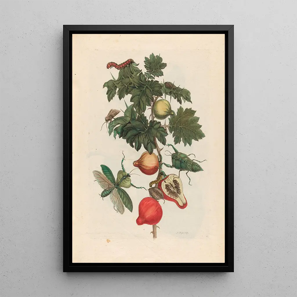 Taidegrafiikka Pomme de Sodome -teoksesta, jonka on luonut Maria Sibylla Merian, johdattaa meidät maailmaan, jossa luonto ja taide kohtaavat harvinaisen hienovaraisesti. Tämä teos, joka on täynnä yksityiskohtia, korostaa kiehtovaa kasvia, joka on usein tuntematon, mutta jonka kirkkaat värit ja orgaaniset muodot vangitsevat katsojan huomion. Vihreän, keltaisen ja punaisen sävyt kietoutuvat harmonisesti yhteen, luoden sekä elävän että salaperäisen tunnelman. Taidegrafiikan tekniikka, jonka taiteilija hallitsee, mahdollistaa jokaisen elementin esittämisen poikkeuksellisen tarkasti, kutsuen katsojan tarkkailemaan luonnon hienouksia huolellisesti.