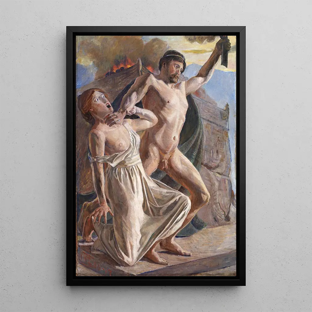 Kohteessa "Prométhée varastaa tulen" Poul Simon Christiansen vangitsee dramaattisen hetken kreikkalaisesta mytologiasta, jossa titani Prométheus, kapinan ja anteliaisuuden symboli, varastaa tulen jumalilta ja antaa sen ihmisille. Kohtaus on esitetty tunteiden voimalla, jossa kirkkaat värit ja vaikuttavat kontrastit kuvaavat taistelua varjon ja valon välillä. Christiansenin tekniikka, joka yhdistää realismia ja romantiikkaa, korostaa tämän rohkean teon dynamiikkaa, luoden sekä sankarillisen että traagisen tunnelman.