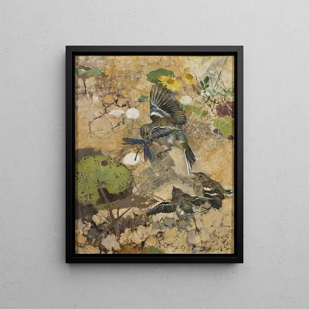 Valloittavassa eläinaiheisessa maailmassa Bruno Liljeforsin teos "Pinsons des arbres et libellules" erottuu hienostuneisuudellaan ja vaikuttavalla realismillaan. Tämä taulu, jossa luonto paljastuu kaikessa loistossaan, kuljettaa meidät maailmaan, jossa jokainen yksityiskohta sykkii aitolla elämällä. Pinssoneilla, joiden räikeä höyhenpuku on eläväinen, näyttää siltä kuin ne heräisivät eloon silmiemme edessä, kun taas libellulat, kevyet ja eteeriset, lisäävät tähän maalaismaisemaan taianomaista tunnelmaa. Taidetulosteen uudelleenluominen kutsuu syvälliseen pohdintaan, tarjoten ikkunan villin ja hauraan ympäristömme kauneuteen.