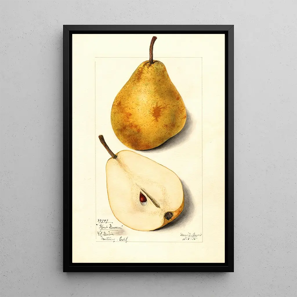 Taidegrafiikka teoksesta "Pyrus communis Glout Morceau" Mary Daisy Arnoldilta kuljettaa meidät herkkyyden ja pehmeyden maailmaan. Tämä taulu korostaa Glout Morceau -päärynää, jonka kultaiset ja vihreät sävyt heijastavat täysillä sesongilla olevien hedelmätarhojen rikkautta. Valo leikkii hedelmän pinnalla, luoden heijastuksia, jotka lisäävät syvyyttä ja elävyyttä teoksen koostumukseen. Arnoldin huolellinen tekniikka mahdollistaa lähes mehukkaan tekstuurin tuntemisen päärynästä, kutsuen katsojan nauttimaan tämän yksinkertaisen mutta hienostuneen hedelmän visuaalisesta esityksestä.