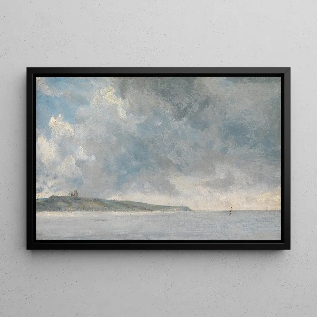 John Constablen taidegrafiikka rannikkonäkymästä jyrkänteineen vie meidät meren äärelle, missä aallot hiljalleen huuhtoutuvat rannalle. Pehmeät ja sävyiset värit, rauhoittavista sinisistä kirkkaisiin vihreisiin, luovat rauhallisuuden ja mietiskelyn ilmapiirin. Constablen tekniikka, joka yhdistää taitavasti realismia romanttiseen tunnelmaan, kutsuu meitä arvostamaan maiseman luonnollista kauneutta. Majesteettiset jyrkänteet, jotka kohoavat taivasta vasten, vaikuttavat kertovan tarinoita menneiltä ajoilta, kun taas valo leikkii veden pinnalla, lisäten tähän kohtaukseen lähes taianomaisen ulottuvuuden.