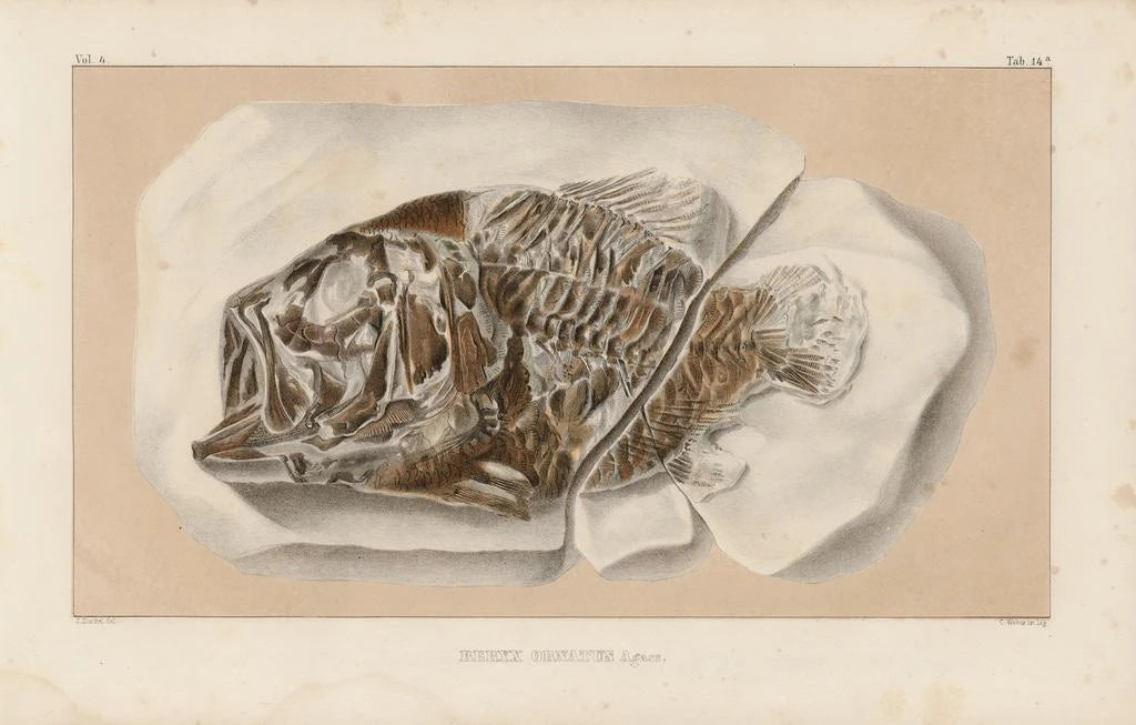 Louis Agassiz, naturaliste et géologue du XIXe siècle, a marqué son époque par ses contributions à la biologie et à la paléontologie. Né en Suisse, il a émigré aux États-Unis où il a fondé le premier musée de sciences naturelles à Harvard. Influencé par les courants scientifiques de son temps, Agassiz a cherché à allier rigueur scientifique et esthétique, ce qui se reflète dans ses œuvres. Ses recherches sur les poissons fossiles ont non seulement enrichi notre compréhension de l'évolution, mais ont également ouvert la voie à une nouvelle approche de l'illustration scientifique, faisant de lui une figure incontournable de l'histoire des sciences.
