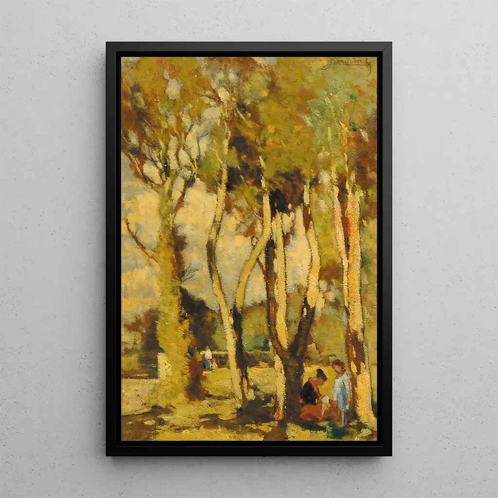 "Repos dans la pinède" est une œuvre qui évoque la tranquillité et la beauté de la nature. Dans cette scène paisible, des personnages se reposent sous l'ombre bienfaisante des arbres, tandis que la lumière filtre à travers le feuillage, créant une atmosphère de douceur et de calme. Les couleurs naturelles, allant des verts profonds aux bruns chauds, renforcent l'harmonie de la composition. La technique de Ludovico Tommasi, qui allie impressionnisme et réalisme, permet de ressentir la fraîcheur de l'air et le murmure des feuilles, transportant le spectateur dans un moment de contemplation et de ressourcement.