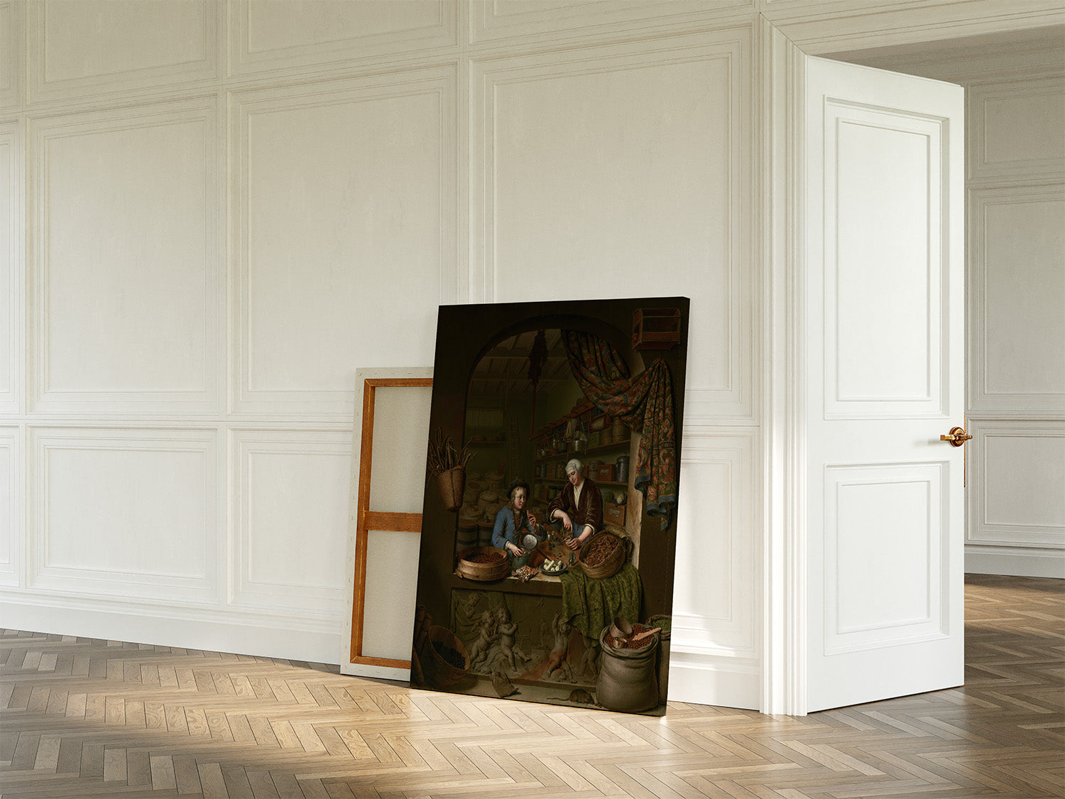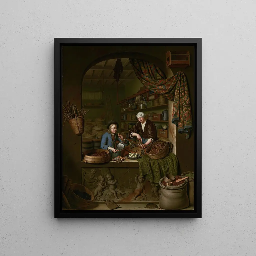 Willem van Mierisin taidegrafiikka Yksi ruokakauppa on ihanteellinen lisä klassisen hienostuneen tunnelman luomiseen sisustukseesi. Ripustettuna keittiöön, ruokasaliin tai olohuoneeseen, se korostaa vieraanvaraisuutta, yltäkylläisyyttä ja aistien nautintoa. Hollantilaisen maalauksen ystävät löytävät siitä genrekohtauksen eleganssia, kun taas historian harrastajat arvostavat sen ainutlaatuista todistetta 1600-luvun arkipäivästä.