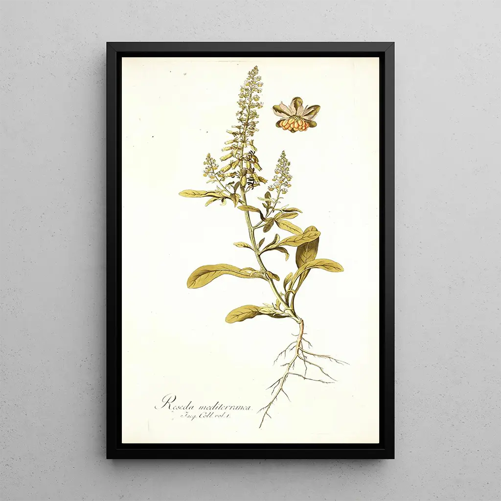Reseda mediterranean taidegrafiikka, jonka on signeerannut Nikolaus Joseph Freiherr von Jacquin, viittaa Välimeren maisemien luonnonkauneuteen. Tämä taidegrafiikka, pehmeillä ja luonnollisilla sävyillä, vangitsee tämän ikonisen kasvin olemuksen, sen hienovaraisesti piirretyt lehdet ja hienovaraiset mutta elegantit kukat. Vesiväritekniikka, jota käytetään hienovaraisesti, herättää tämän teoksen eloon, luoden rauhallisen ja pohdiskelevan ilmapiirin. Jokainen sivellinvedos tuntuu hengittävän Välimeren auringon lämpöä, kutsuen katsojan pakoon aurinkoisiin rantoihin ja reheviin puutarhoihin.