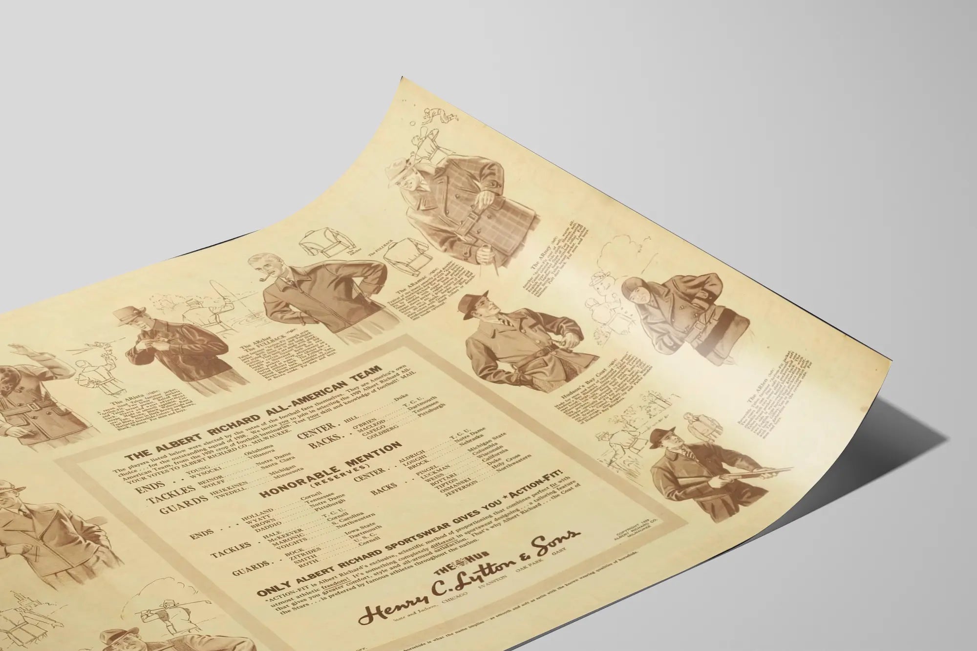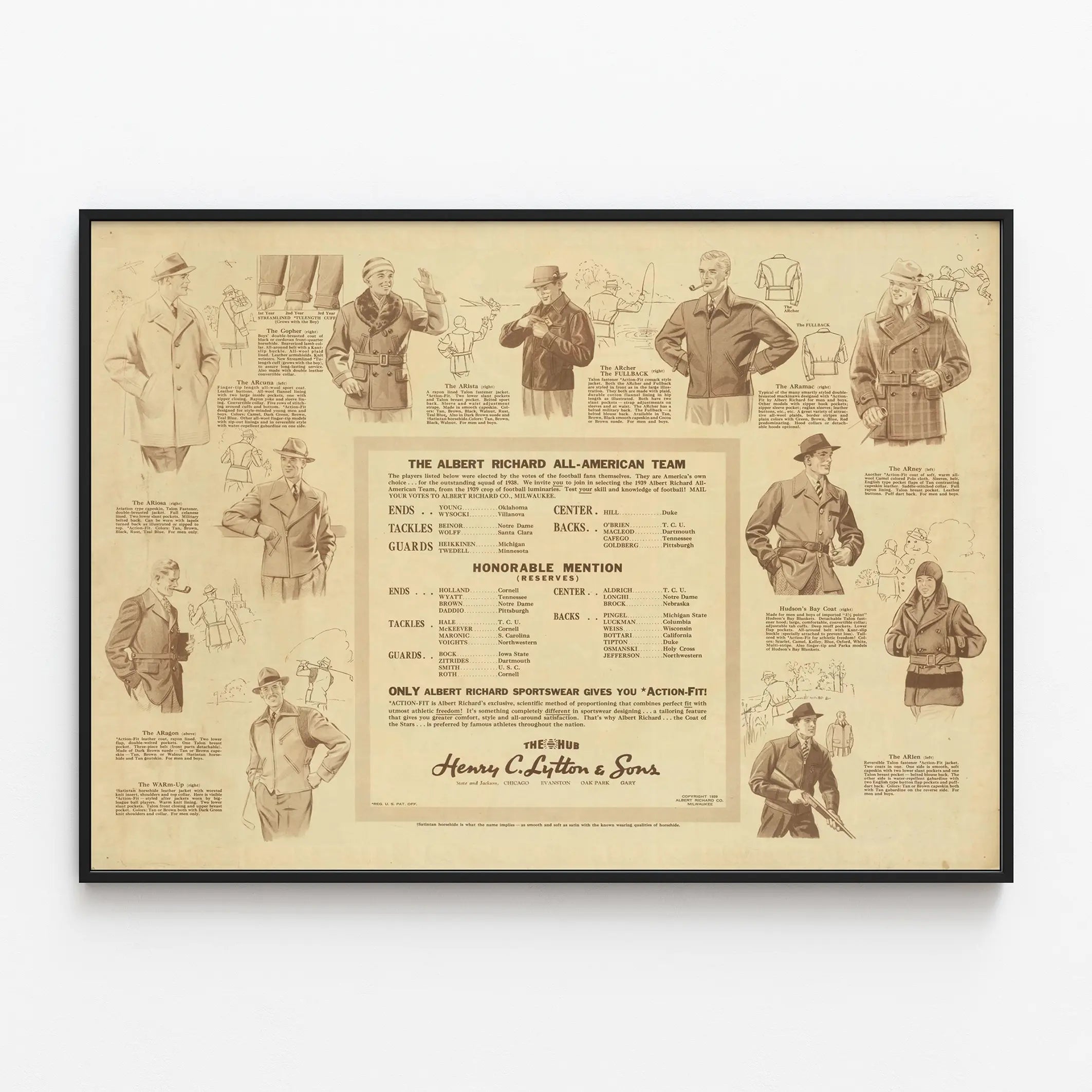 Tämä 1939-luvulta peräisin oleva vintage-plakaatti esittelee sarjan yksityiskohtaisia kuvituksia ikonillisista miesten vaatteista aikakaudelta, jotka liittyvät kuuluisaan Albert Richardin johtamaan amerikkalaiseen jalkapallojoukkueeseen. Esitetty seinäkoriste leikkii taitavasti yhdistelmällä urheilullista ja amerikkalaista klassista muotia, erittäin autenttisessa retro-tyylissä. Jokainen piirros kuvaa miesten mallia, joka on pukeutunut tarkasti, korostaen eri takkeja, liivejä ja asusteita, joita käytettiin 1930-luvulla. Näihin kuvituksiin on lisätty teknisiä kuvauksia kankaista, leikkauksesta ja vaatteiden ominaisuuksista, tarjoten sekä visuaalisen että informatiivisen kokemuksen. Keskellä teosta on lista amerikkalaisista jalkapalloilijoista, jotka valittiin vuoden 1938 parhaiksi, kehysten ympärillä tämä vintage-henkeä huokuva teos Albert Richardin nimissä. Täydellinen seinätaulu, tämä painatus sopii urheiluhistorian, retro-muodin ja graafisen suunnittelun harrastajille. Tämä seinätaulu tuo charmia ja eleganssia mihin tahansa sisustukseen, joka haluaa heijastaa aikakauden tyyliä ja henkeä. Monokromaattisella sepia-efektillä tämä plakaatti luo nostalgisen tunnelman, ihanteellinen olohuoneeseen, toimistoon tai pelihuoneeseen. Sopii myös urheilupostaajien ja vanhojen mainoskuvien keräilijöille; tämä kiehtova kuvaus herättää eloon amerikkalaisen jalkapallon maailman ja aikakauden funktionaalisten ja tyylikkäiden vaatteiden laadun. Värjää seinäkoristustasi tällä ainutlaatuisella teoksella, joka yhdistää taiteen ja urheilun erittäin huolellisesti suunnitellussa vintage-estetiikassa, täydellinen tilaan, jossa on vahva identiteetti.