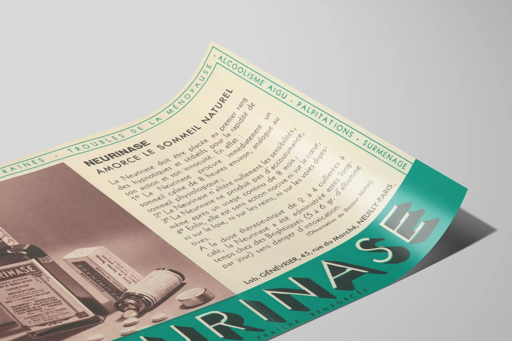 Tämä vintage-neurinaasitaulu on ihanteellinen seinäkoriste retrotyylin ja farmaseuttisen aitouden ystäville. Esittäen vanhan ranskalaisen farmaseuttisen tuotteen, juliste korostaa Neurinase-pulloa alkuperäisessä laatikossaan, viitaten aikaan, jolloin mainonta perustui yksinkertaiseen muotoiluun ja yksityiskohtaisiin kuvaileviin teksteihin. Graafinen tyyli, joka on tyypillinen 1900-luvun puolivälin aikakaudelle, lisää perinteistä eleganssia jokaiseen sisustukseen harmonisten sepia- ja vihreän sävyjen ansiosta.