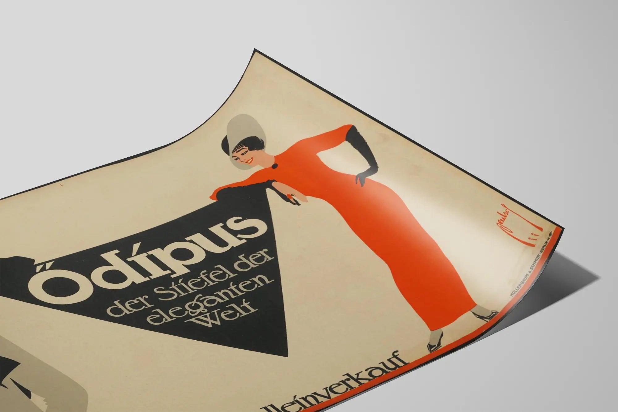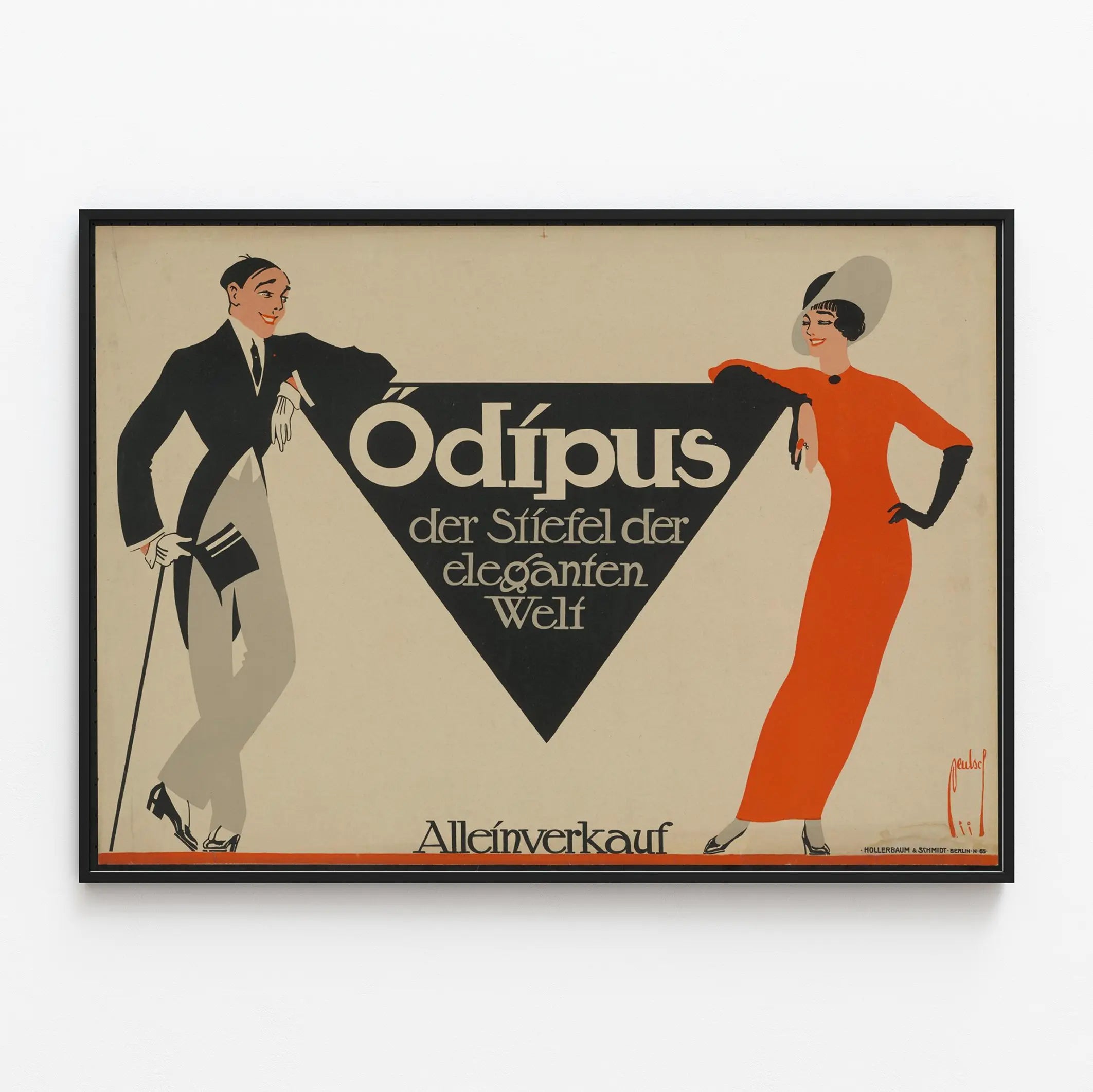 Tämä vintage juliste nimeltä "Oedipus" esittää tyylikkään pariskunnan, joka on kuvattu retro-tyylisellä graafisella tavalla, tyypillinen art deco -tyylille. Hahmot on pukeutunut suurella hienostuneisuudella: mies käyttää mustaa pukuun, valkoisia hanskoja ja lierihattua, kun taas nainen pukeutuu pitkään kirkkaan punaiseen mekkoon, jonka viimeistelevät mustat hansikkaat ja leveämpi reunainen hattu, mikä korostaa tiettyä hienostuneisuutta. Tyylitellyt siluetit kehystävät julisteen keskellä olevaa mustaa kolmiota, johon on kirjoitettu saksankielinen teksti "Ódípus der Stiefel der eleganten Welt", mikä luo voimakkaan visuaalisen kontrastin ja kiinnittää heti huomion pääviestiin.