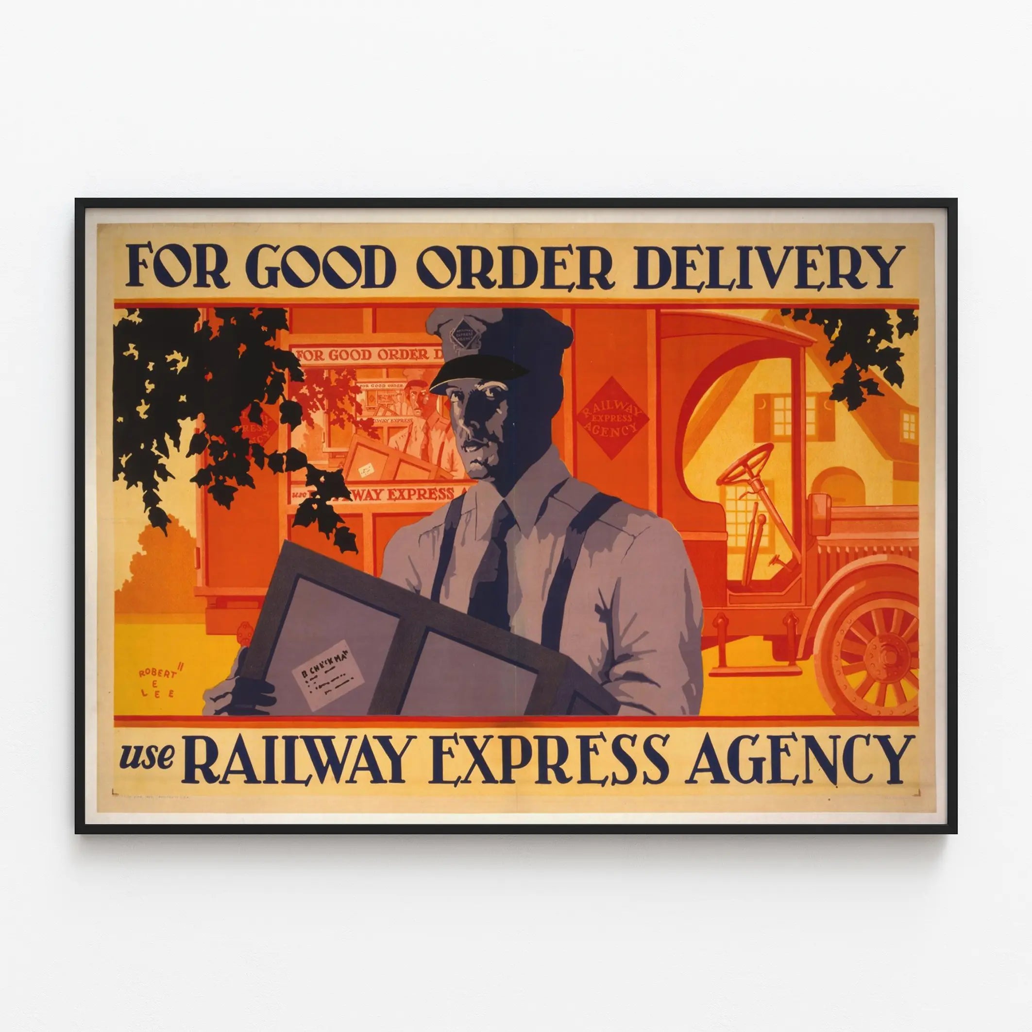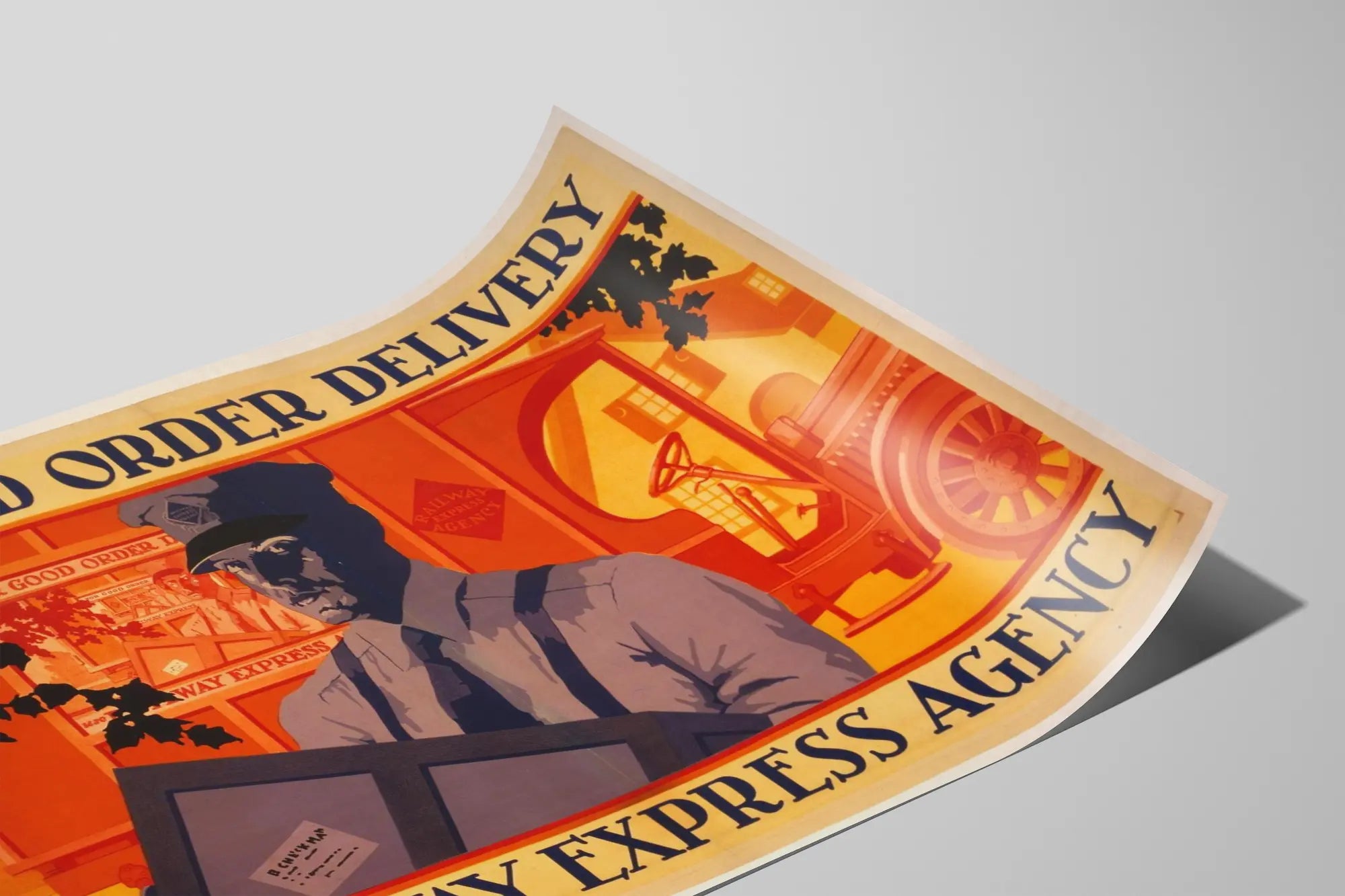 Tämä vintage- juliste esittää uniformuun pukeutunutta jakelija-ammattilaista, joka pitää pakettia punaisen "Railway Express Agency" -merkittyn kuorma-auton edessä. Graafinen tyyli käyttää lämpimiä sävyjä, pääasiassa oranssia, ja päähenkilön päällä on sinisenharmaita varjoja, mikä luo voimakkaan kontrastin ja retrohenkisen tunnelman. Yläosassa teksti "FOR GOOD ORDER DELIVERY" kannustaa valitsemaan tämän toimituspalvelun, korostaen luotettavuutta ja laadukasta kuljetusta. Alhaalla oleva viesti "use RAILWAY EXPRESS AGENCY" täydentää kutsua luovuttaa pakettinsa tähän pikatoimistoon. Tämä retro- ja teollisuustyylinen seinäkoriste on ihanteellinen vanhojen julisteiden, vintage- sisustuksen tai autenttisen tunnelman luomiseen, joka muistuttaa rautatie- ja maantiekuljetuksen kulta-ajasta. Julisteformaatti tuo ainutlaatuisen lisän toimistoon, työhuoneeseen tai oleskelutilaan, korostaen toimituksen ja asiakaspalvelun teemaa. Tämä seinätaulu on kutsu järjestelmällisyyteen ja luottamukseen pikapalveluissa, täydellinen seinäkoriste, joka yhdistää estetiikan ja historian. Olipa kyseessä yksinkertainen juliste tai kehystetty koriste-esine, se tarjoaa ainutlaatuisen näkökulman logistiikan ja kuljetuksen teemaan, tehden tästä teoksesta vahvan ja vaikuttavan koristevalinnan.