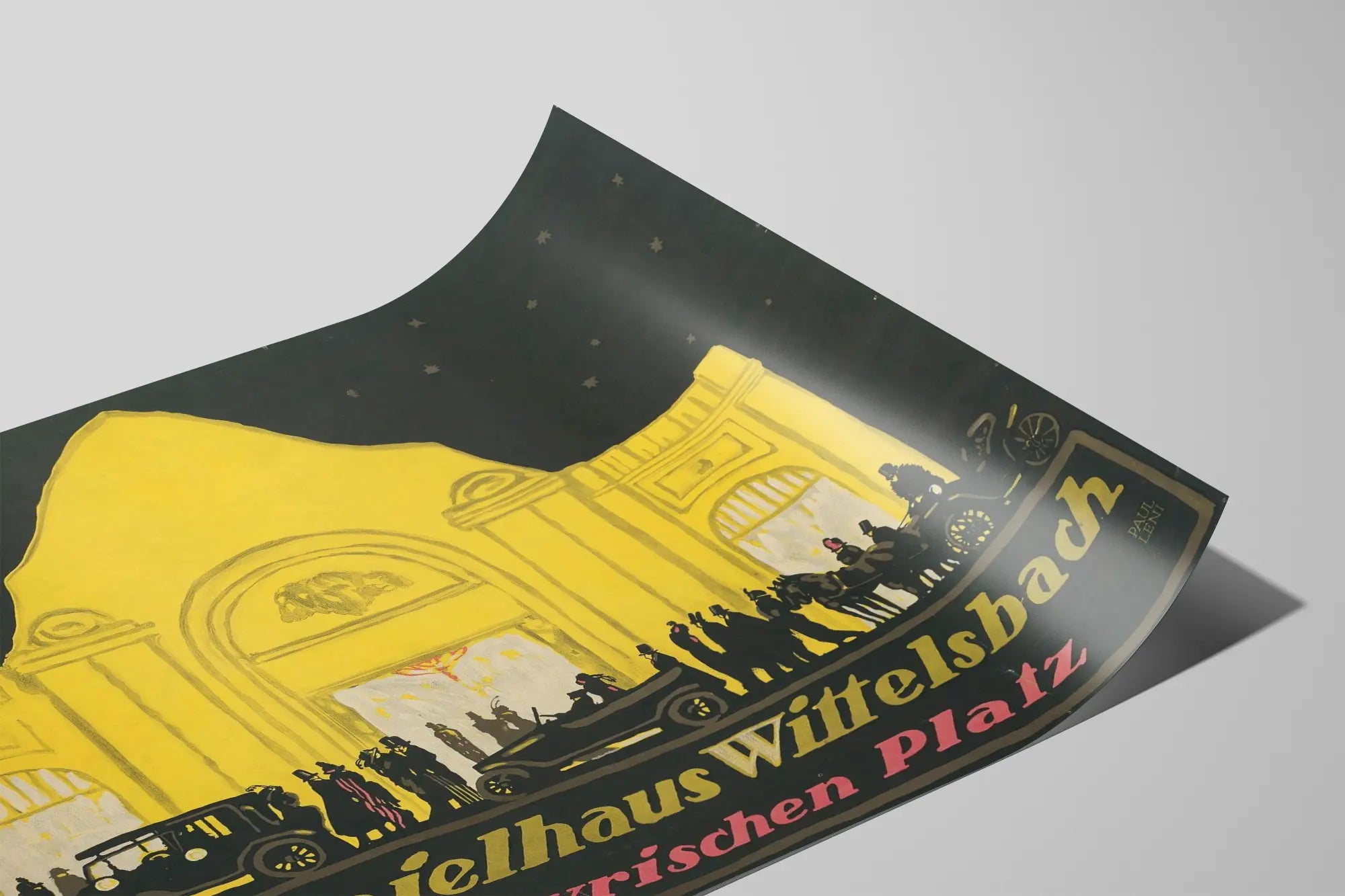 Tämä vintage-plakaatti esittelee valaistun julkisivun Wittelsbachin valoteatterista, ikoninen paikka Bayrischen Platzilla. Graafinen koostumus korostaa vaikuttavaa kontrastia rakennuksen kirkkaan keltaisen hohteen ja ohikulkijoiden, vanhojen autojen sekä hevosvaunun mustan siluetin välillä. Tähtitaivasta koristava yötaivas täydentää tämän urbaanin kohtauksen tyylikästä ja ajattomasti eleganttia tunnelmaa. Täydellinen retro-seinäkoristeiden harrastajille tai niille, jotka haluavat tuoda historiaa ja charmia sisustukseensa, tämä plakaatti lisää taiteellista ja kertovaa sävyä mihin tahansa tilaan. Graafinen tyylinsä, joka yhdistää yksinkertaisuuden ja huolellisesti sijoitetut yksityiskohdat, tekee siitä vaikuttavan osan alkuperäistä seinätaidetta. Olipa kyseessä olohuone, makuuhuone tai toimisto, tämä vintage-plakaatti on huomiota herättävä seinäkoriste, joka inspiroi ja stimuloi mielikuvitusta. Lämmin ja historiallinen tunnelma, se sopii täydellisesti sekä klassiseen että nykyaikaiseen sisustukseen, heijastaen aikaa, jolloin kaupunkityylin eleganssi yhdistyi arkkitehtoniseen hienostuneisuuteen. Näyttämällä tämän julisteen arvostat taiteellista kuvaa hetkestä, joka on pysähtynyt aikaan, yhdistäen menneen ja nykyisen esteettiseen ja hienostuneeseen seinäkoristukseen.