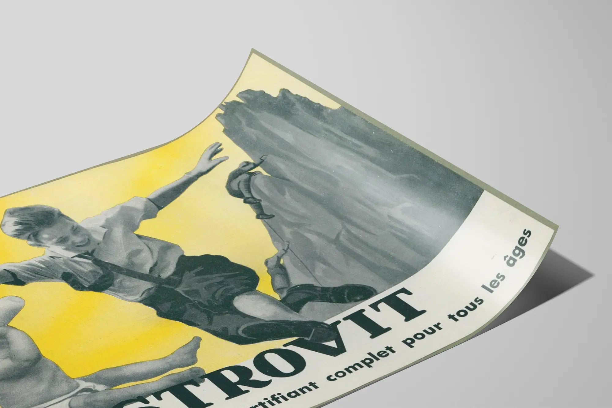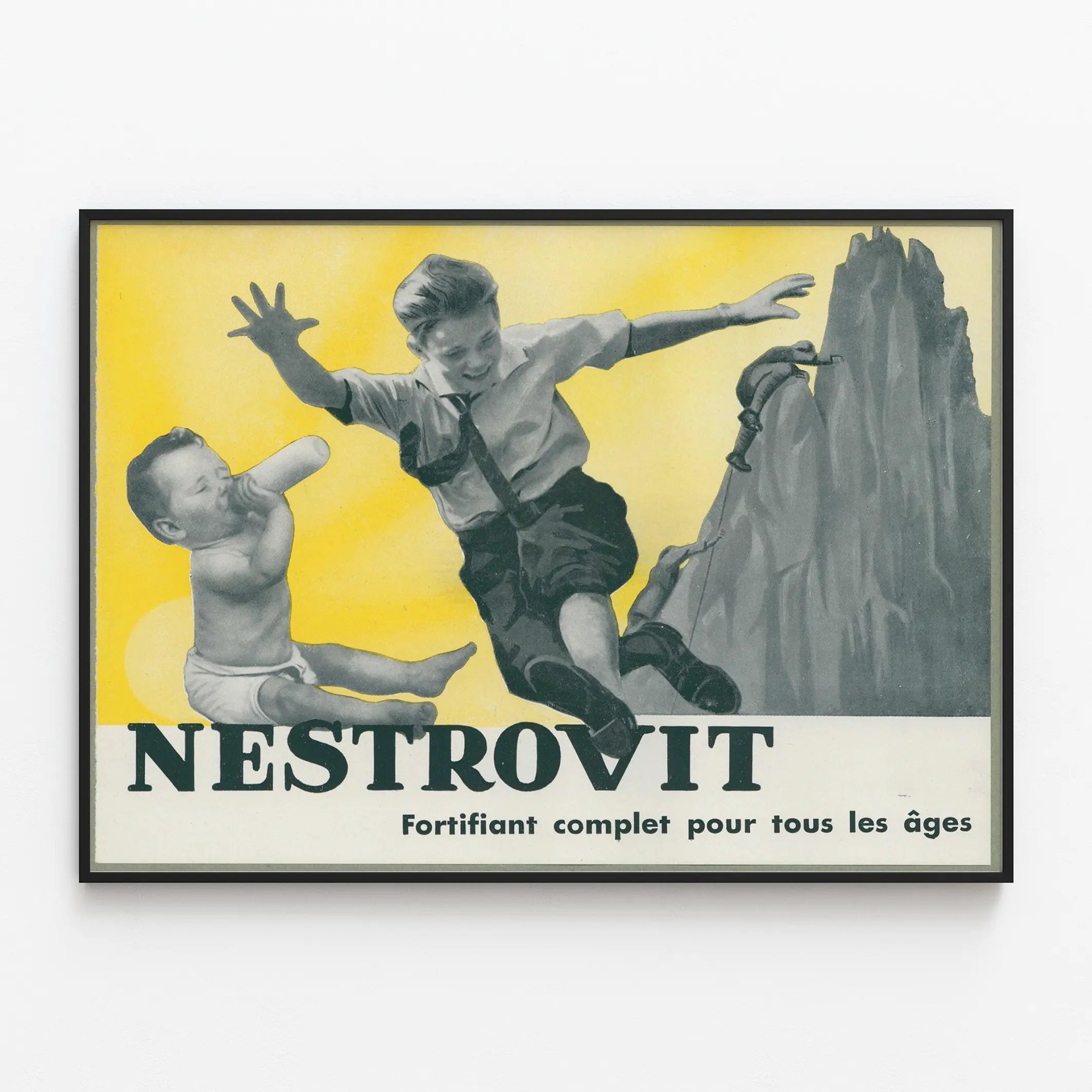 Tämä vintage Nestrovit -taidegrafiikka on ainutlaatuinen seinäkoriste, joka tuo tilaan ripauksen retroa ja nostalgiaa. Se kuvaa iloisesti hyppäävää poikaa paidassa ja kravattia, seuranaan imettävä vauva tuttipullosta, kirkkaan keltaisella taustalla, joka symboloi elinvoimaa ja energiaa. Taustan takana vuoristomiehet kiipeävät kallioseinämää, mikä kuvastaa voimaa ja päättäväisyyttä, vahvistaen tuotteen viestiä: kokonaisvaltainen vahvistaja kaikenikäisille. Tämä alkuperäinen mainosjuliste sopii täydellisesti kodin viihtyisiin tiloihin, kuten olohuoneeseen, keittiöön tai toimistoon, tuoden samalla vanhan ajan charmia. Valmistettu taidegrafiikan jäljentämiseen soveltuvista materiaaleista, se on ihanteellinen vintage-seinäkoristeiden harrastajille, jotka haluavat rikastuttaa kokoelmaansa dynaamisella ja esteettisellä kuvalla. Hahmojen mustavalkoinen kontrasti ja keltainen tausta tekevät tästä taidegrafiikasta houkuttelevan ja helposti sovitettavissa eri sisustustyyleihin, klassisesta nykyaikaiseen. Olitpa sitten kiinnostunut vanhoista mainosjulisteista tai etsit vain alkuperäistä seinäkoristetta, tämä Nestrovit -taidegrafiikka on kutsu löytöretkelle ja terveyden sekä voiman esittämiseen yksinkertaisen koskettavalla kuvalla. Tuokaa seinillenne ripaus dynamiikkaa ja historiaa tämän nostalgisen julisteen avulla, joka puhuttelee sekä aikuisia että nuorempia.