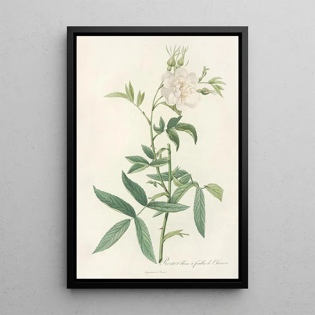Taidegrafiikka Rosa Alba Cimbaefolia, Pierre Joseph Redoutén ikonisesta teoksesta, kutsuu meitä ihailemaan valkoisten ruusujen loistoa. Tämä taulu, pehmeine sävyineen ja hienovaraisine muotoineen, herättää puhtauden ja rauhan tunteen. Vesiväritekniikka, jonka Redouté hallitsi mestarillisesti, mahdollistaa herkkien terälehtien ja lehtien vivahteiden kunnioittamisen, luoden rauhoittavan ilmapiirin. Jokainen yksityiskohta on huolellisesti työstetty, mikä kertoo taiteilijan rakkaudesta luontoon ja halusta vangita kukkien ohikiitävä kauneus.
