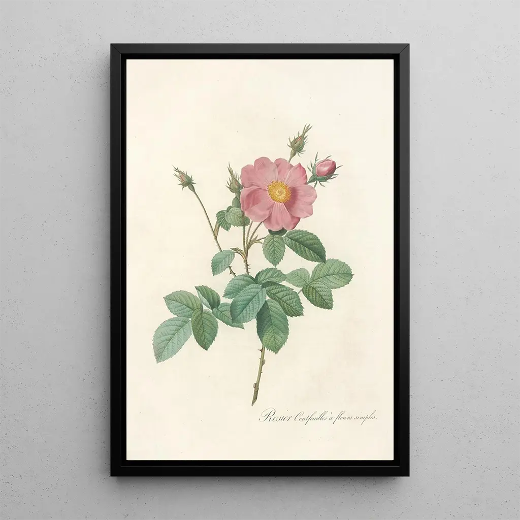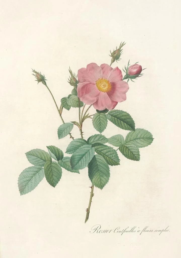 Pierre Joseph Redouté, 1700-luvun merkittävä taiteilija, tunnetaan kukkamaalauksistaan, jotka yhdistävät taiteen ja tieteen. Hänen työnsä on saanut vaikutteita kuninkaallisista puutarhoista, ja hänellä oli kunnia maalata Ranskan hoville, erityisesti Marie-Antoinette:lle. Redouté onnistui vangitsemaan kukkien kauneuden niin tarkasti, että häntä pidetään usein taidegrafiikan pioneerinä. "Rosa Centifolia Simplex" on yksi hänen ikonisista teoksistaan, joka todistaa hänen poikkeuksellisen lahjakkuutensa ja omistautumisensa luonnon uskolliseen esittämiseen.