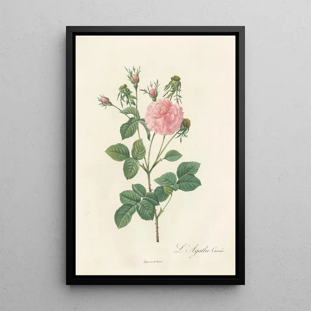 Rosa Gallica Agatha Incarnata -taidegrafiikka johdattaa meidät pehmeyden ja luonnonkauneuden maailmaan. Pierre Joseph Redouté'n teos, joka on tunnettu kasviillustraatioistaan, erottuu hienostuneiden pastellisävyjensä ja huolellisesti työstettyjen yksityiskohtiensa ansiosta. Ruusun terälehdet, pehmeän vaaleanpunaiset, tuntuvat lähes kosketeltavilta, kun taas lehtien vihreän sävyt luovat rauhoittavan harmonian. Redouté'n hallitsema akvarellitekniikka antaa tälle taululle kevyen ja ilmavan tunnelman, kutsuen katsojan ihmettelemään luonnon loistoa.