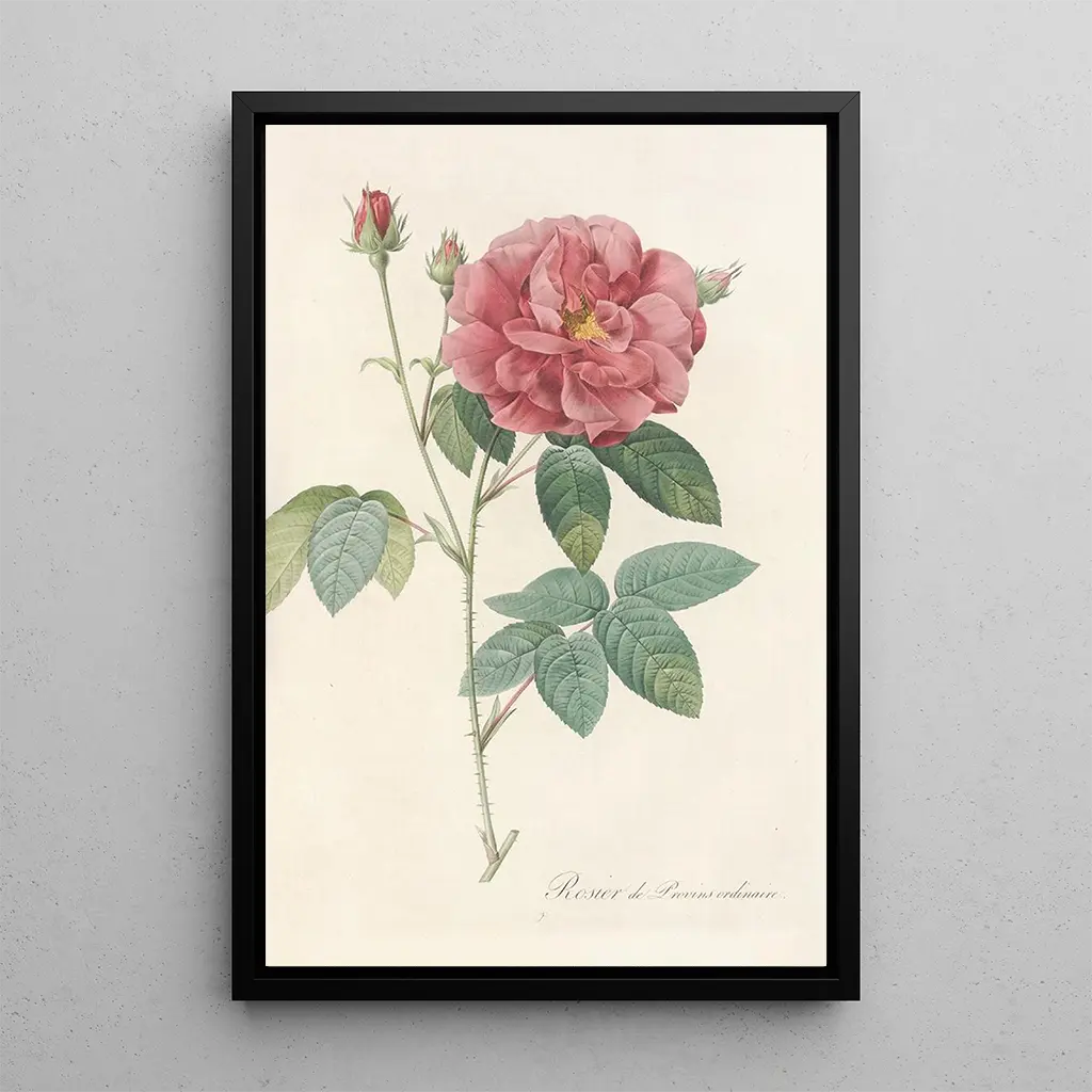 Taidegrafiikkaa Rosa Gallica Officinalis vie meidät kukkivaan maailmaan, jossa pehmeys ja hienostuneisuus kohtaavat. Pétale, vaaleanpunainen ja herkkä, avautuvat arvokkaasti, kun taas lehtien vihreät sävyt luovat harmonisen kontrastin. Pierre Joseph Redouté hallitsi vesiväritekniikkaa, mikä antaa tälle teokselle keveyttä ja läpinäkyvyyttä, jotka muistuttavat ruusujen ohikiitävää kauneutta. Tämä kangas huokuu mietiskelyn tunnelmaa, kuin jokainen yksityiskohta olisi luonnon ylistys.