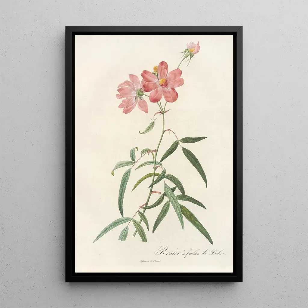 La taidegrafiikka Rosa Longifolia, jonka on tehnyt Pierre Joseph Redouté, on todellinen luonnon juhla. Pitkät, hoikat varret, jotka on koristeltu herkillä kukilla, herättävät luonnollisen arvokkuuden ja ajattoman eleganssin tunteen. Vaaleanpunaisen ja vihreän sävyt, hienovaraisesti vivahteikkaat, vangitsevat valon tavalla, joka saa sielun värähtelemään. Vesiväritekniikka, joka oli Redouté'lle erityisen rakas, mahdollistaa jokaisen yksityiskohdan esittämisen poikkeuksellisen hienovaraisesti, luoden rauhallisen ja kauniin ilmapiirin. Tämä teos kutsuu meitä arvostamaan kasvilajien herkkää monimutkaisuutta ja hienostuneisuutta.