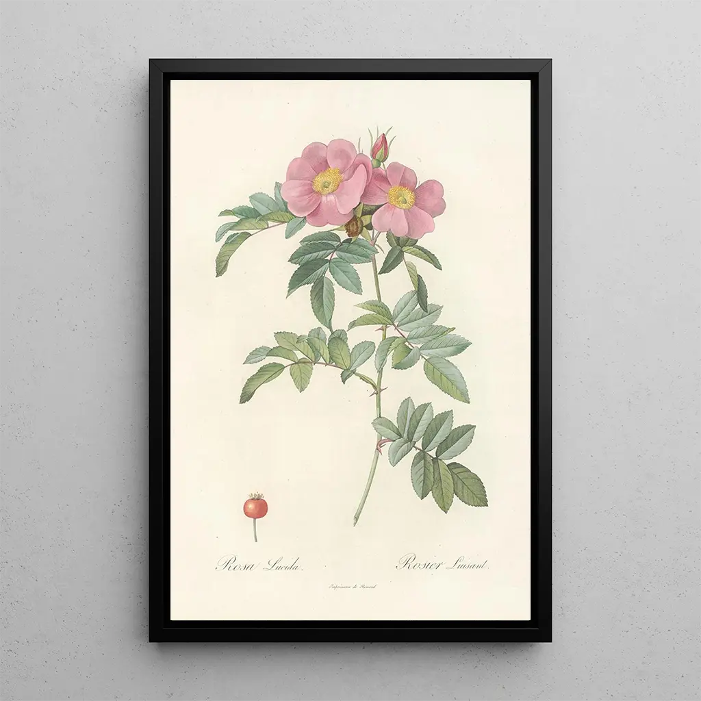 Rosa Lucida, Pierre Joseph Redouté'n merkittävä teos, herättää ajattoman arvokkuuden hienostuneesti maalatuilla terälehdillään. Kompositio korostaa vaaleanpunaisen ja vihreän sävyjä, luoden visuaalisen harmonian, joka vangitsee heti katseen. Akvarellitekniikka, jonka taiteilija hallitsee, mahdollistaa tekstuurien ja valonheijastusten tarkasti palauttamisen kukissa. Tämän kankaan välittämä tunnelma on sekä rauhallinen että kiehtova, kutsuen pitkäkestoiseen luonnonkauneuden ihailuun.