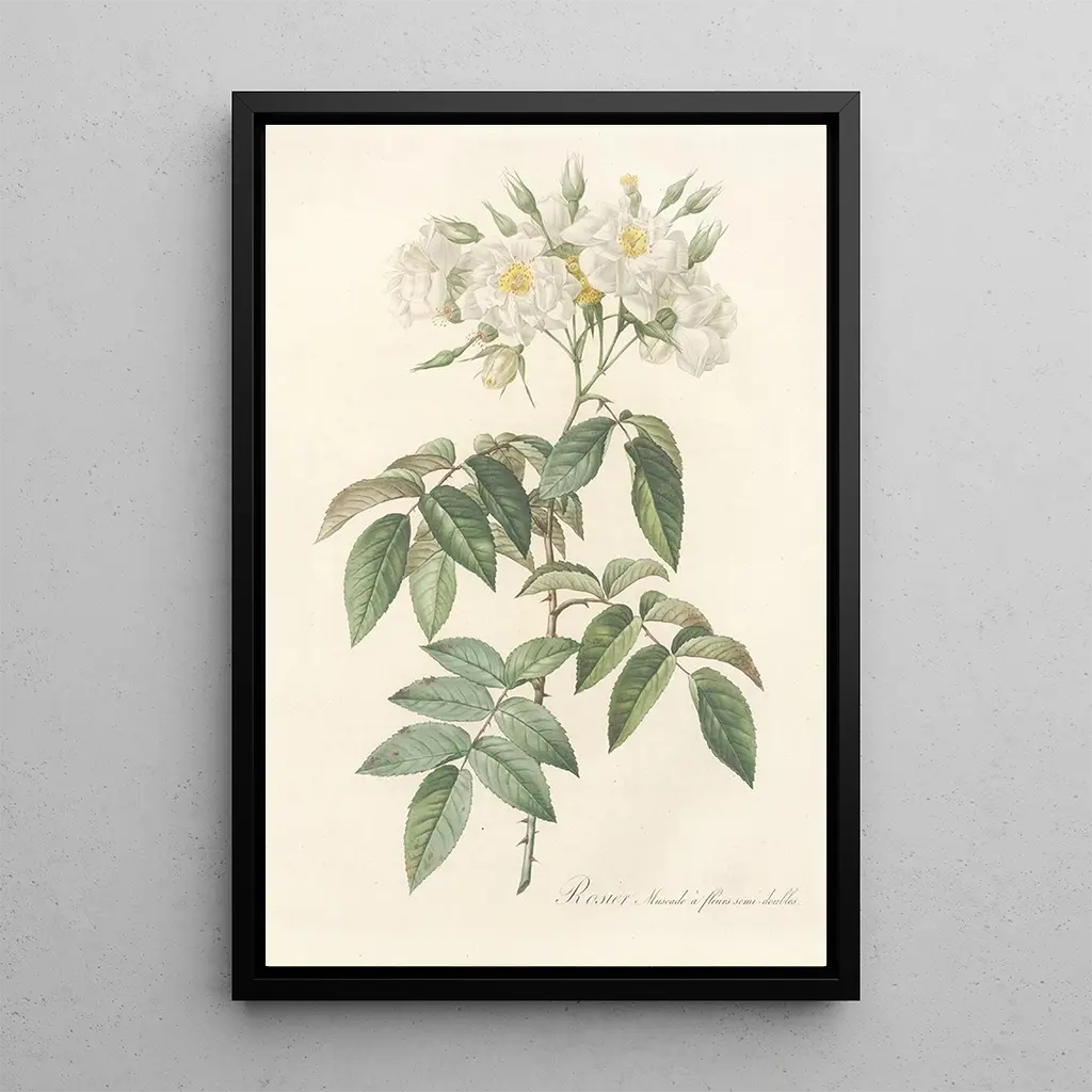 La taidegrafiikka Rosa Moschata Flore Semi-Pleno, jonka on tehnyt Pierre Joseph Redouté, johdattaa meidät pehmeyden ja keveyden maailmaan. Tämä kangas, jonka ominaispiirteitä ovat pastellivärit ja huolellinen toteutus, kuvaa loistavasti luonnon ohikiitävää kauneutta. Herkät terälehdet, vaaleanpunaisen ja valkoisen sävyissä, tuntuvat lähes kosketeltavilta, kun taas hienovarainen tausta korostaa kukintaa. Redouté, joka tunnetaan kasvitieteellisestä lähestymistavastaan, käyttää vesivärimaalauksen tekniikoita, jotka antavat hänen teoksilleen rauhallisen ja pohdiskelevan tunnelman, kutsuen katsojan ihailemaan jokaista yksityiskohtaa.
