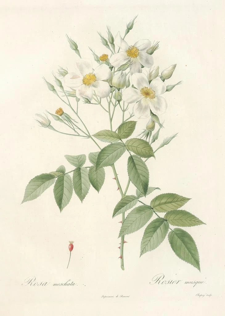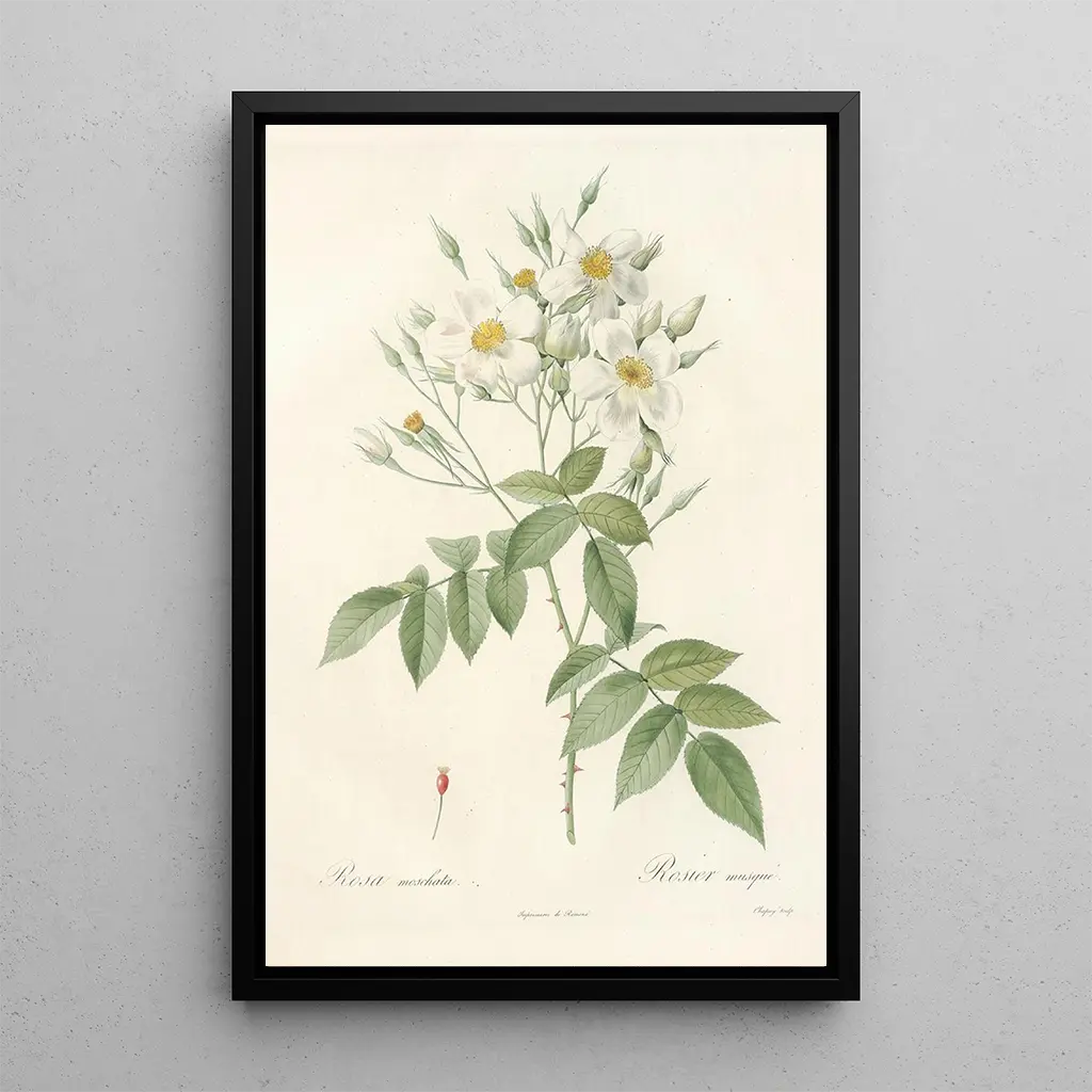 Rosa Moschata, Pierre Joseph Redouté'n merkittävä taidegrafiikka, herättää hienostuneen ja herkkäkauniin loiston. Tämä taulu, pehmeine väreineen ja huolellisine yksityiskohtineen, vangitsee itse ruusun moschatan olemuksen, kukka, jota arvostetaan sen lumoavan tuoksun vuoksi. Vaaleanpunaisen ja kerman sävyt, yhdistettynä vihreisiin vivahteisiin, luovat rauhoittavan ja romanttisen tunnelman. Redouté, hänen tarkalla tekniikallaan, onnistuu herättämään tämän kukkaelämän eloon, kutsuen katsojan arvostamaan luonnon katoavaista kauneutta taiteellisen näkemyksensä kautta.