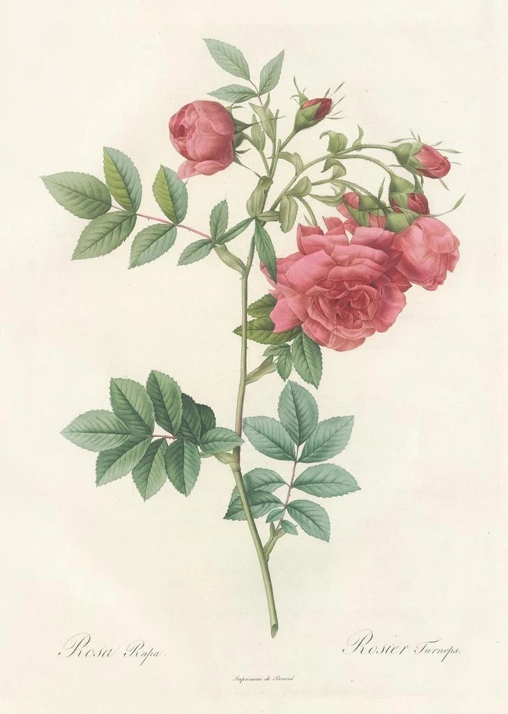 Rosa Rapa -taidegrafiikan, Pierre Joseph Redouté'n ikonisen teoksen, tulkinta on kutsu tutustua kukkien herkkään kauneuteen. Tämä taulu erottuu pehmeillä sävyillään ja harmonisella koostumuksellaan, jossa jokainen terälehti vaikuttaa vangitsevan valon ainutlaatuisella tavalla. Redouté'n käyttämä vesiväritekniikka mahdollistaa kukkien läpinäkyvyyden ja keveyden kuvaamisen, luoden unenomaisen tunnelman. Yksityiskohtien tarkkuus, vaaleanpunaisen sävyt ja lehtien hienovaraiset vivahteet todistavat taiteilijan poikkeuksellisesta taidosta esittää luonnonkauneutta hienovaraisesti.
