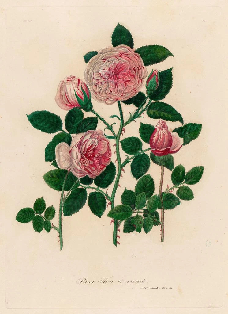 Rosa thea ja variet: värikylläisen puutarhan taidegrafiikka